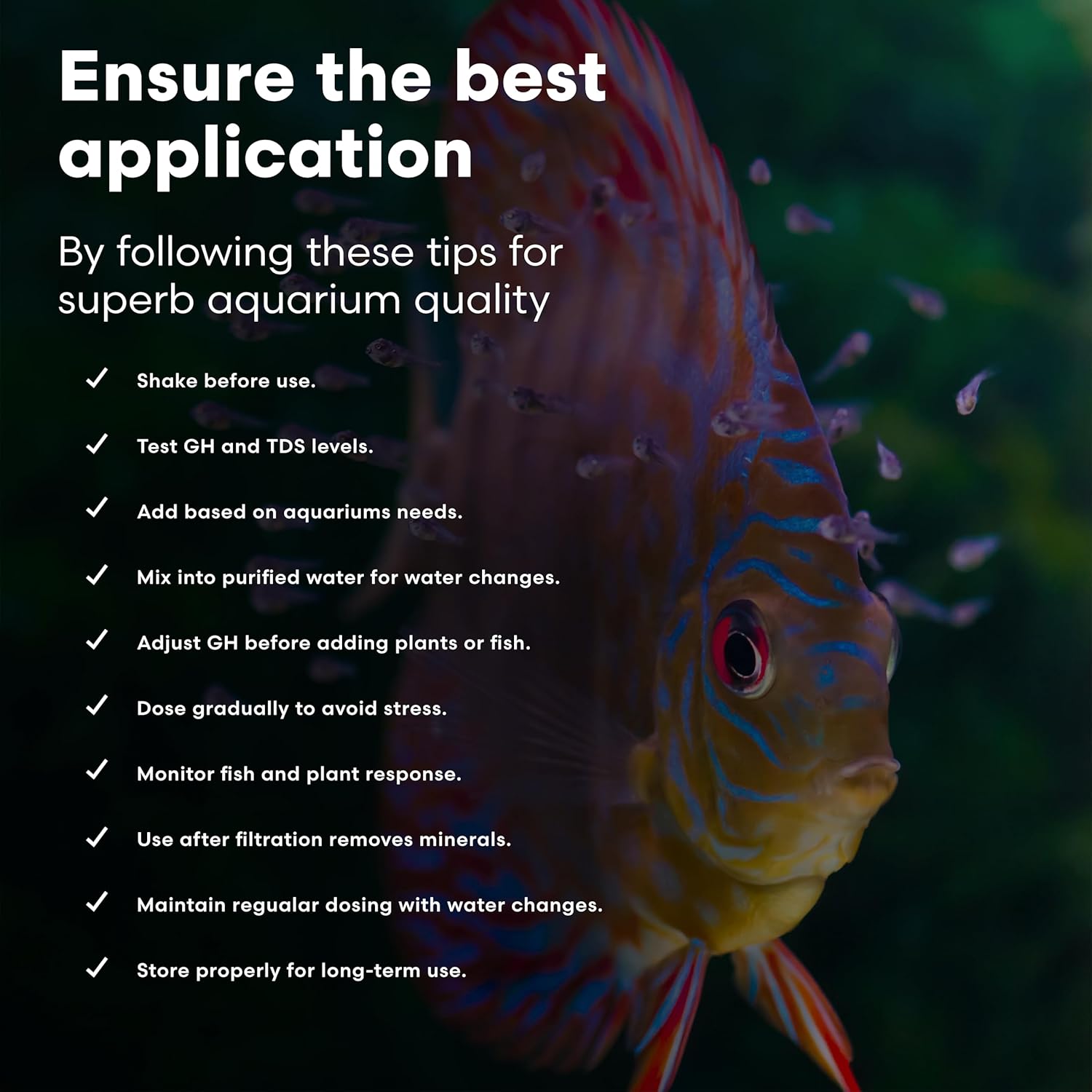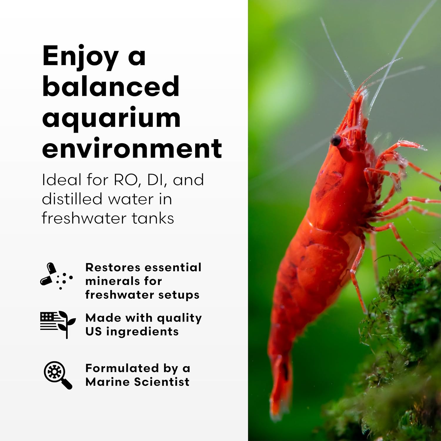 • Establishes an optimal mineral balance in water that has been purified, filtered, (reverse osmosis, deionization, distilled etc.) or is exceedingly soft (well water in forested regions) for all freshwater aquariums