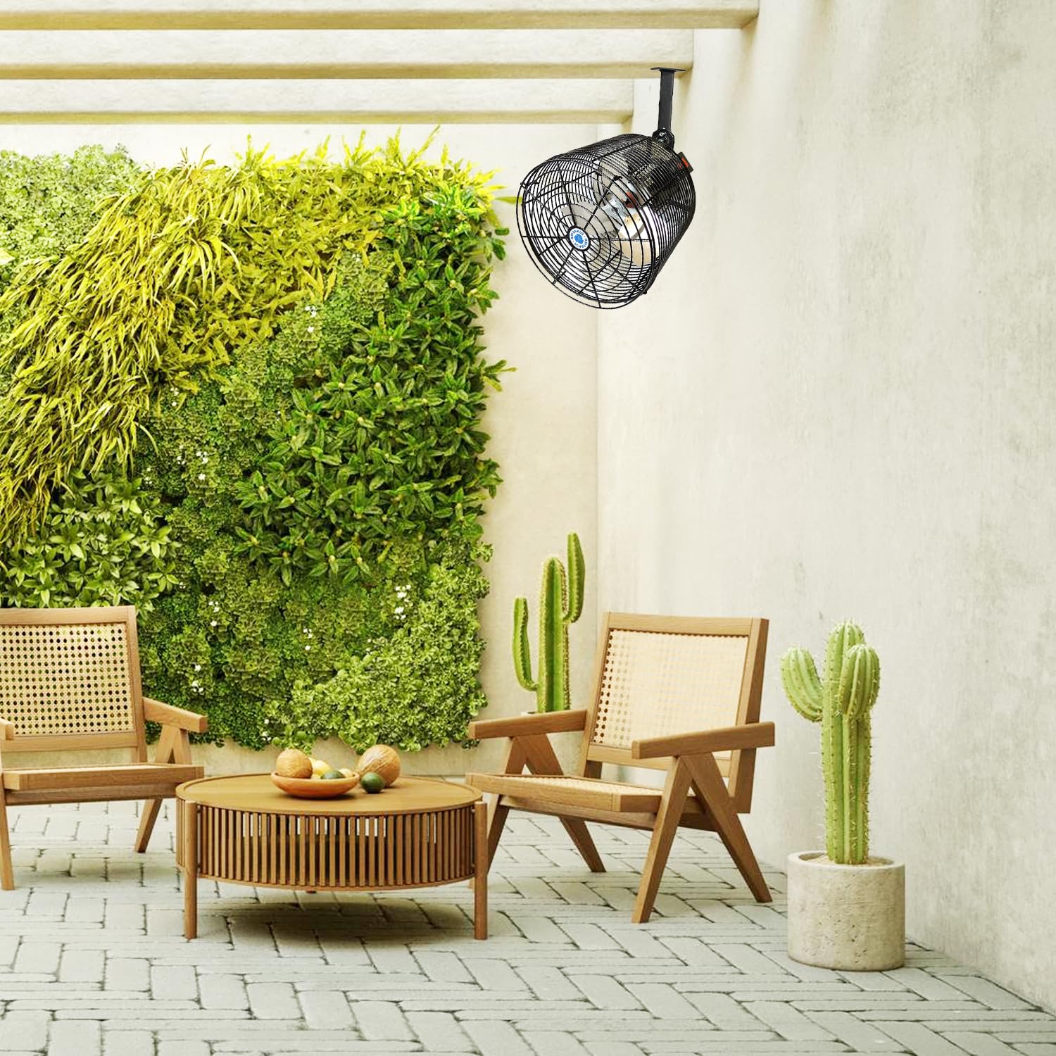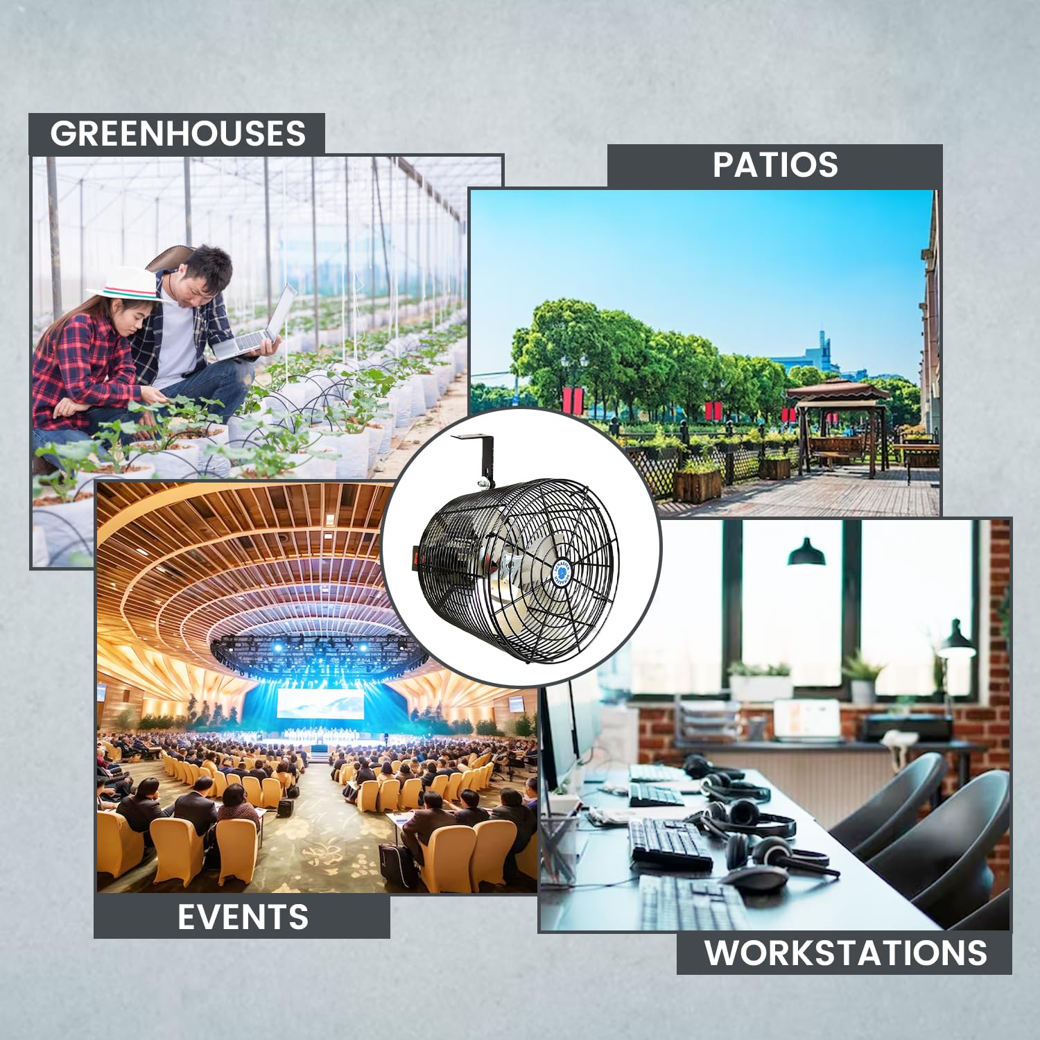 • QUIETER COOL: Experience effective temperature control with the deep-guard design of this wall-mounted fan, minimizing noise without compromising on safety. It's the outdoor fans' solution for events, blending performance and tranquility. FAN BLADES: Includes 3 Aluminum Metallic Blades, Powder Coated Steel Black Guard. 1470 CFM-Free Air