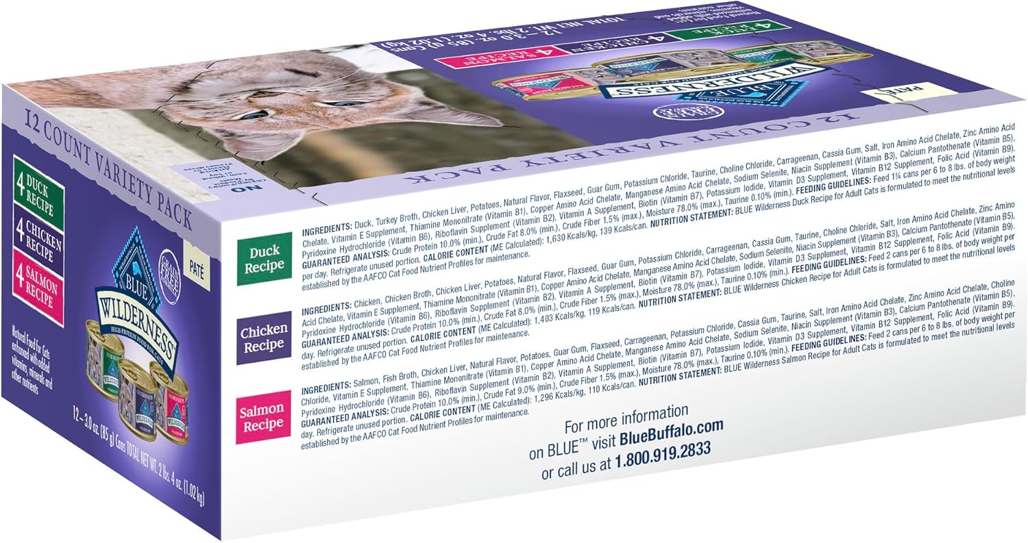 • Contains One (1) Variety Pack of BLUE Wilderness High Protein Grain Free, Natural Adult Pate Wet Cat Food, Chicken, Salmon, Duck 3-oz (12 count- 4 of each flavor)