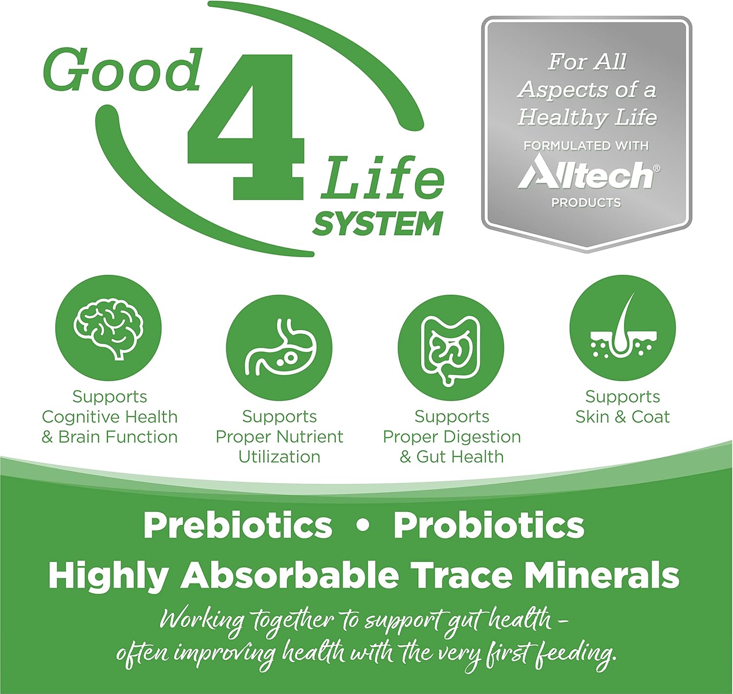 • Our revolutionary supplement system, good 4 life, Includes 4 key ingredients. They work together to condition, repair and promote gut health in all animals-often improving health with the first feeding.