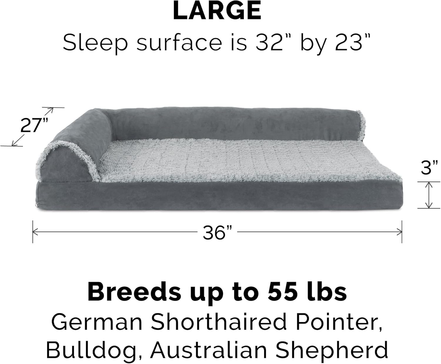 - PRODUCT DETAILS: Stone Gray; Large, 36" x 27" x 6.5" (3" Foam; Sleep Surface: Approx. 32" x 23")