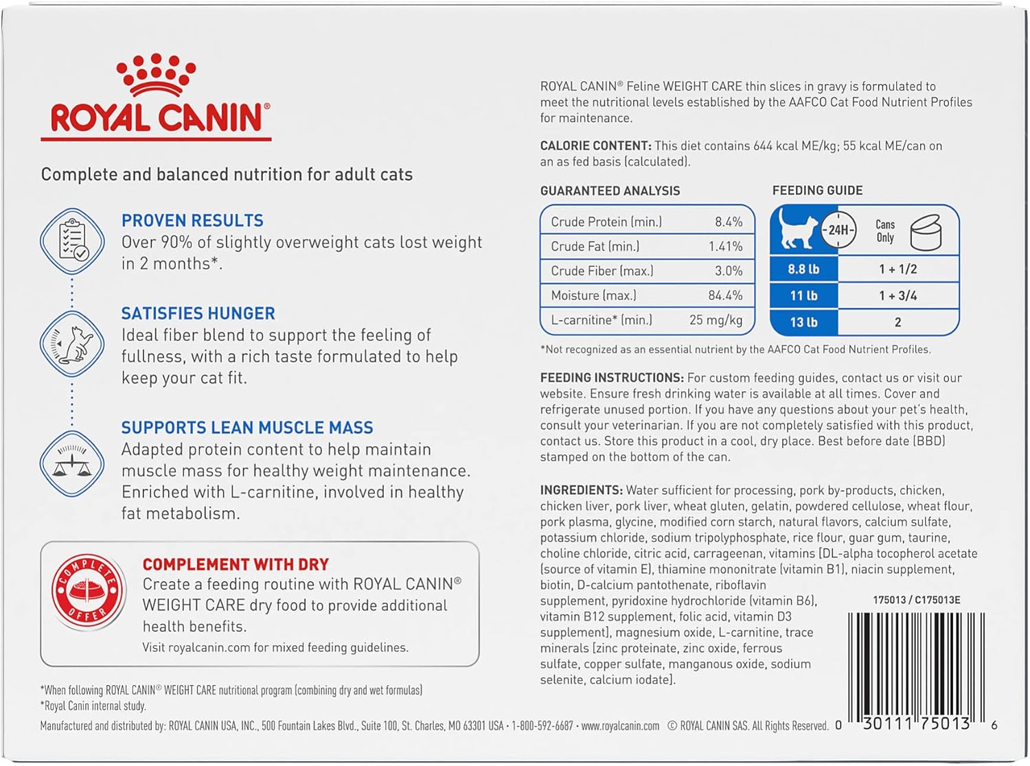 - FOR SLIGHTLY OVERWEIGHT CATS: Royal Canin Feline Weight Care Wet Cat Food delivers complete and balanced nutrition for adult cats that have a tendency to gain weight or that need to lose a little bit of weight