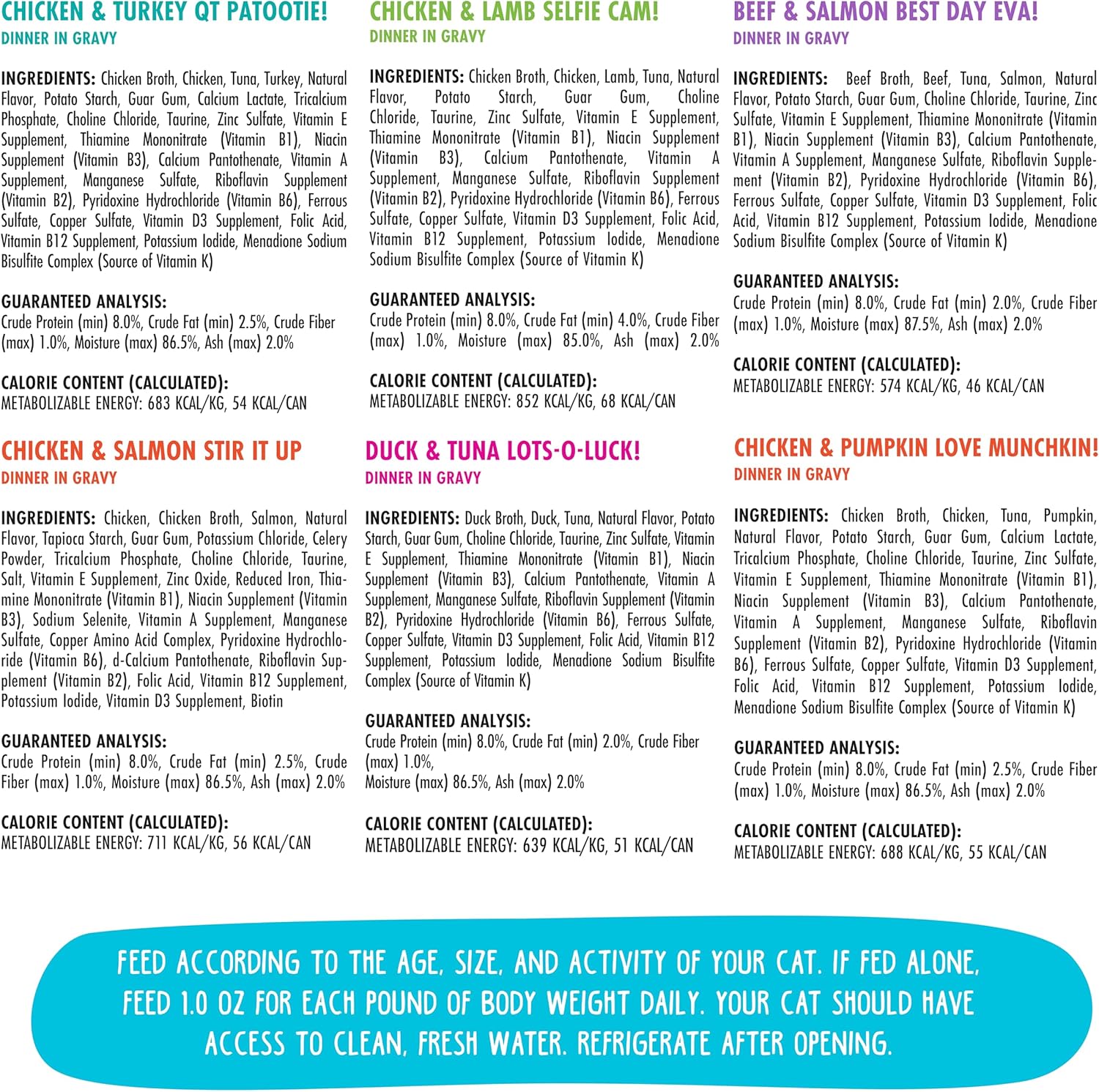 - Rainbow Road Variety Pack (2.8oz Cans, Pack of 12) OMG, Six different flavors in one variety pack! Featuring premium proteins like chicken, salmon,turkey, lamb, duck, and beef in a tasty gravy.