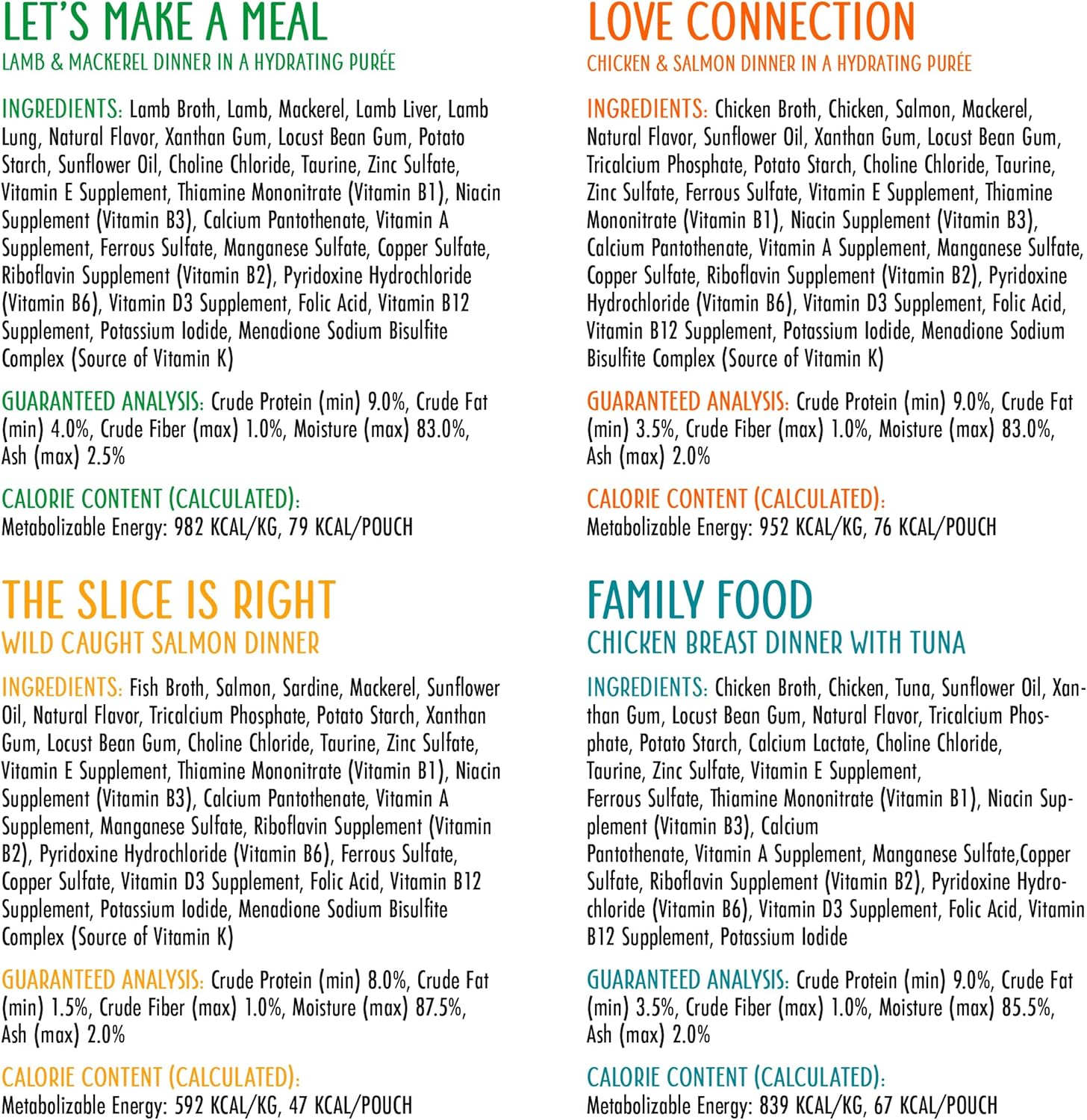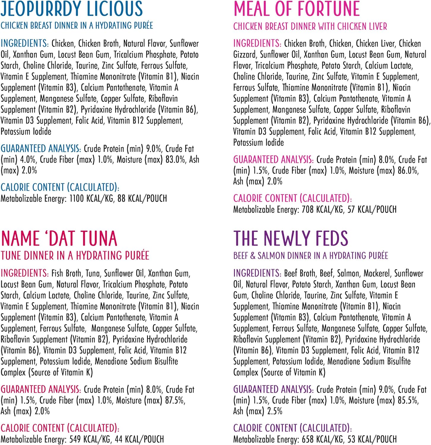 • Variety Pack includes 2 pouches of each: The Newly Feds, Jeopurrdy Licious, Love Connection, Let’s Make a Meal, Meal of Fortune, Name 'Dat Tuna, The Slice is Right, Family Food