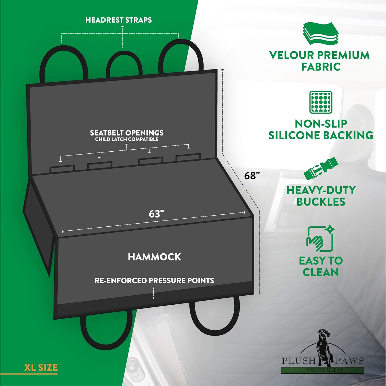 Plush Paws Products Velvet Rear Car Seat Protector w/Hammock | Washable & Waterproof Back Seat Dog Cover for Car, Truck, & SUV | Nonslip, Tear Resistant Pet Seat Cover | X-Large Charcoal