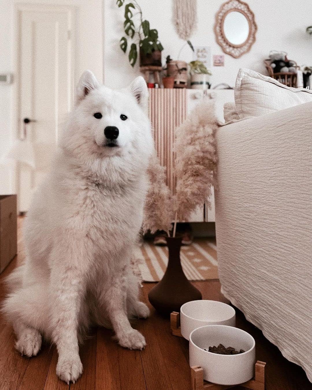 • Double Bowl Design:One dog bowl for food and one for water, Each ceramic cat bowl has a Unique wooden stand, raising the dishes closer to your pet for more comfortable eating