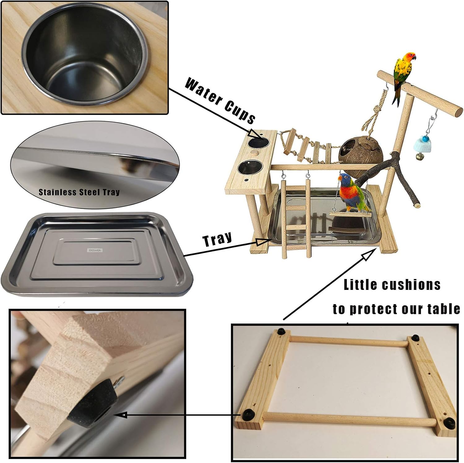 • HAVE A FUN BIRD PLAY GROUND: Package includes all the parts of bird stand, including screws, a tray, toy, water cups. Besides, we put a little screwdriver in the package for assembling it. You can refer to this data before you buy it to see if it is suitable for your birds. PLZ NOTE the size dimension, if your birds are too big, please choose our other larger wooden stand