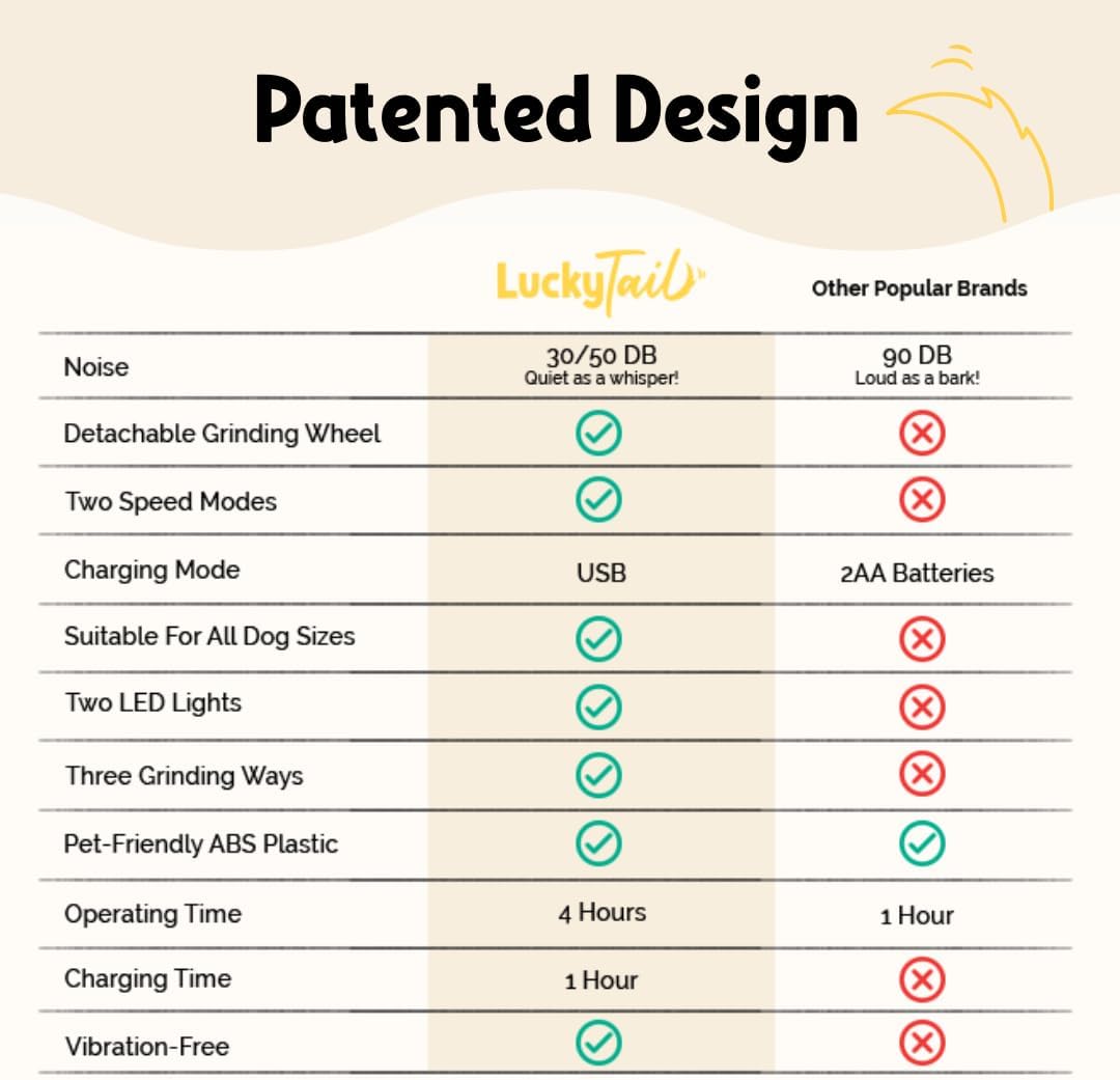 • Patented Design: With our unique and innovative design, we created the gentlest and quietest electric nail grinder for dogs and cats. At 30 - 45 DBs our dog and cat nail grinder omits half the sound compared to popular competitors at 110 DBs. You and your furry bestie can finally say goodbye to stressful nail trims.