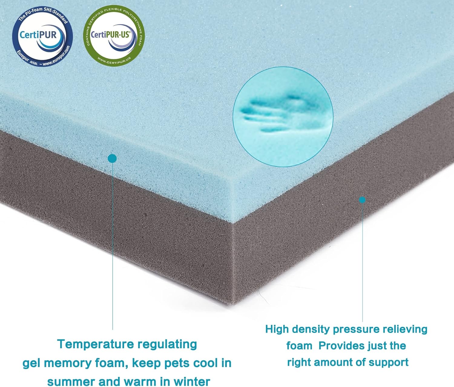 • COOLING GEL&DENISTY MEMORY FOAM:Cooling gel has a cooling effect and can keep your dog cool in the hot summer days. The high density memory foam supports the dog's body, reduces joint pressure.