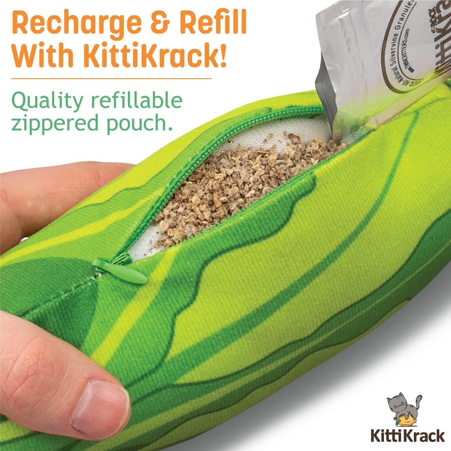 • Refillable Cat Toy: Each KittiVeggi plush cat toy is able to be refilled with TWINCRITTERS KittiKrack Rock refills so your furry friend can keep the fun going! Our silver vine cat and kitten toys are a great compliment to regular cat treats and are purr-fect for playing, teething, and can stand up to the signature "kitty kicking".