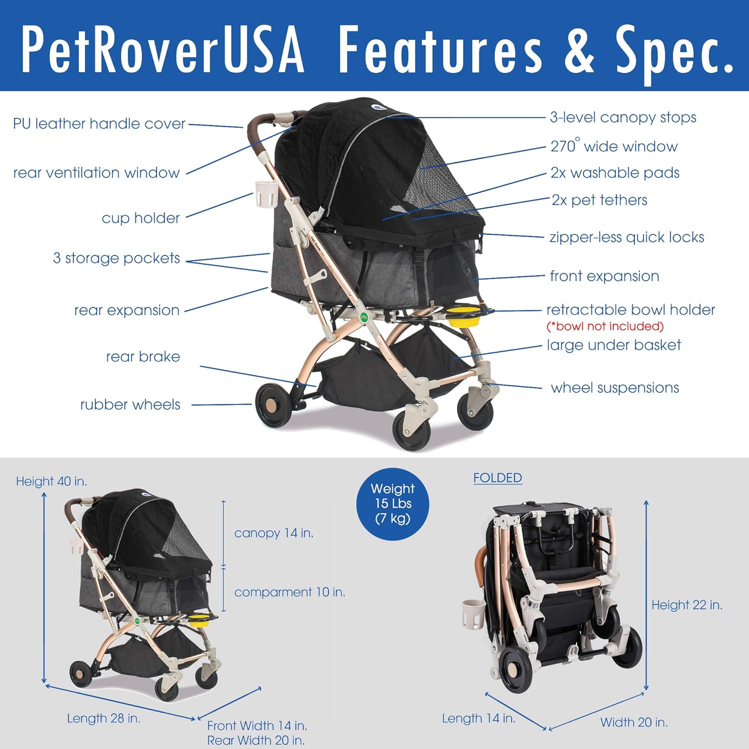 Lite Premium Light-Weight Dog/Cat/Pet Stroller Travel Carriage with Convertible Compartment/Zipper-Less Entry/1-Hand Quick Fold/Aluminum Frame for Small & Medium Pets (Black 2nd-Gen.)