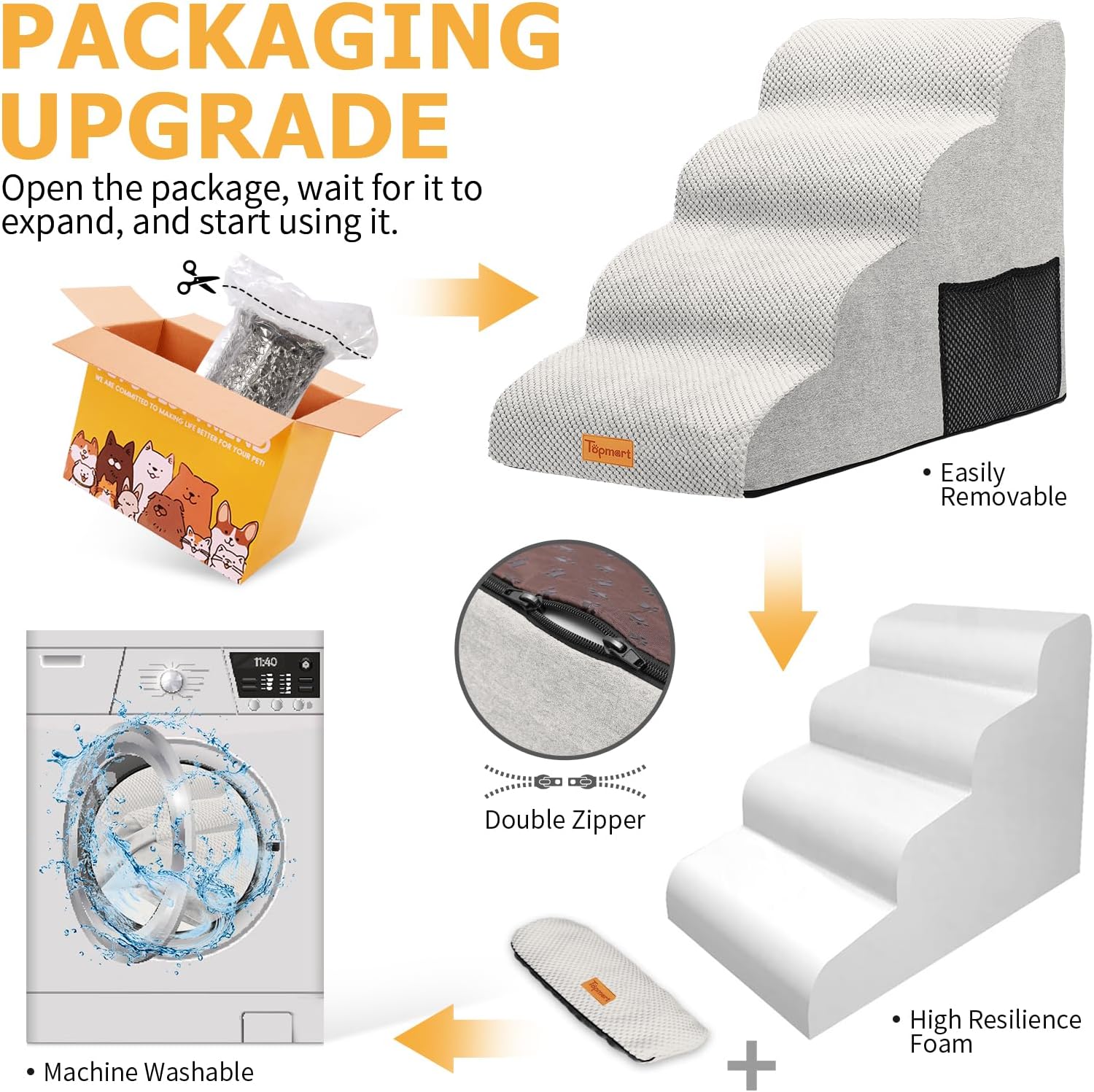 • High Quality Sponge: Made of 30D high-density sponge, strong resilience, not easy to deformation, very durable. Soft sponge provides a very comfortable touch to the pet. Even if the pet runs and plays or human accidentally hit the Topmart dog stairs will not be injured.