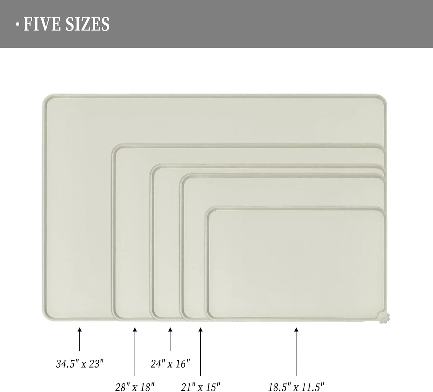 - Various sizes available: our pet mats come in 5 different sizes - 18.5" x 11.5", 22" x 14", 24" x 16", 28" x 18", and 32" x 24". Suitable for all kinds of pets, from puppies to large pets, choose the perfect size for your furry friends and avoid messy spills at mealtime