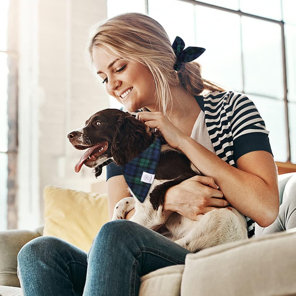 E-Clover Dog Bandanas Boy & Matching Scrunchie Set Plaid Scarf Kerchief for Small Dog Puppy Bandana Pet Owner Blue Green Fall