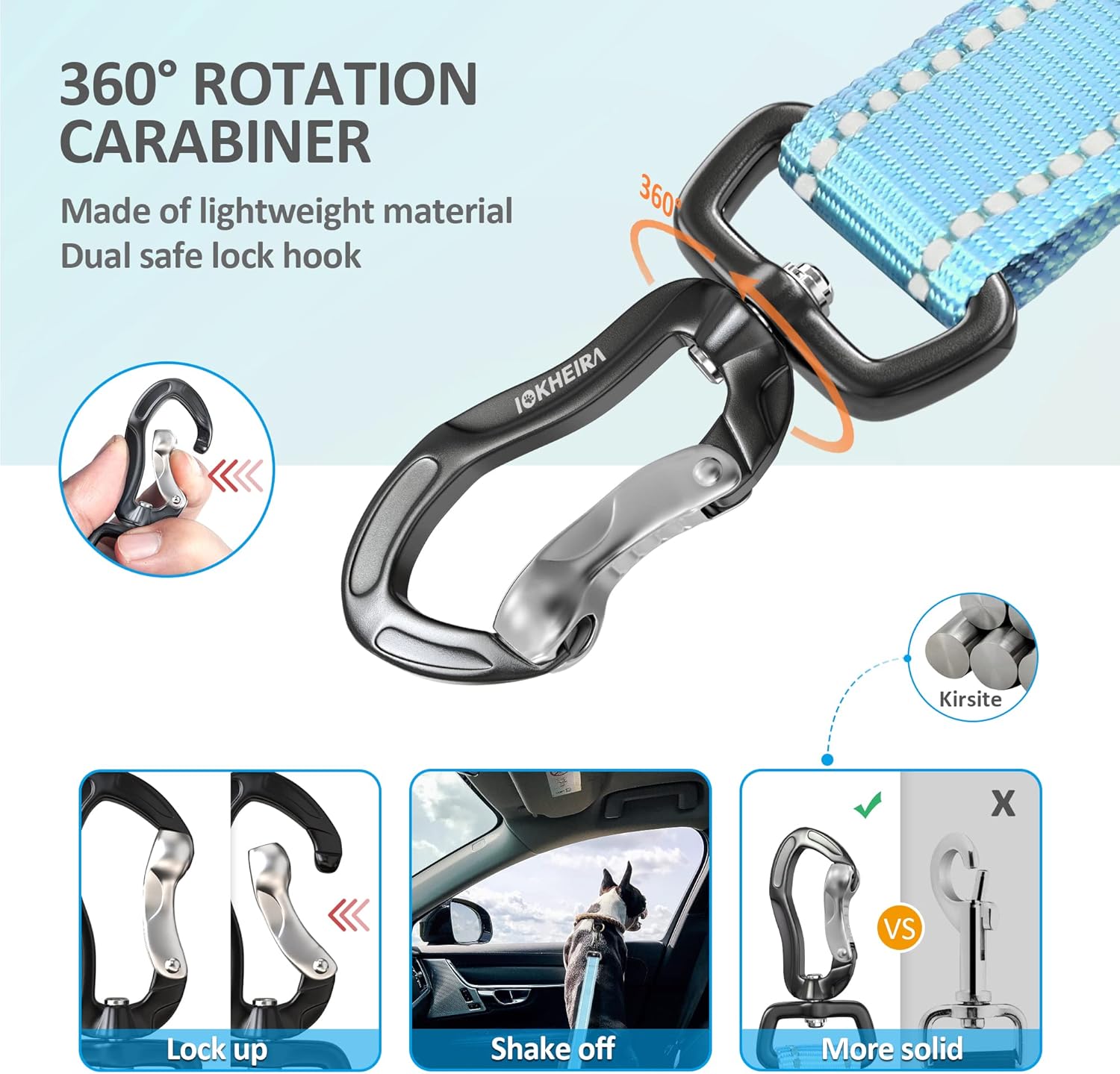 • Double Buckle Design: Our IOKHEIRA dog seat belt is designed with two different types of safety buckles on one end. One is hook latch, which can attach to the child safety seat and the car trunk. The other one is seatbelt buckle, which is the same as a typical human seat buckle, can stick directly into the seatbelt slot. Our buckle design is universal for all cars!