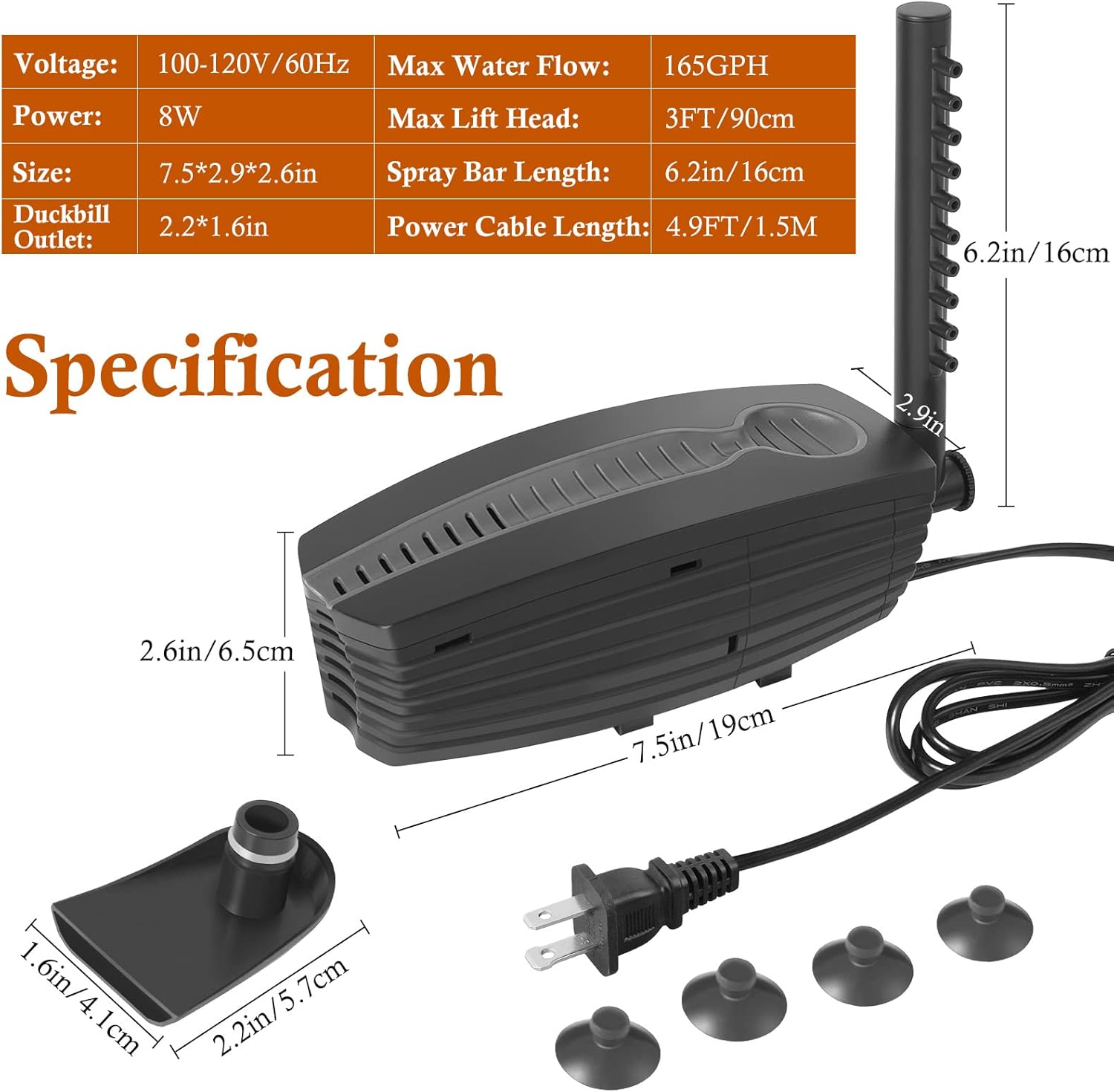 • 【Specifications】Powerful aquarium internal filter, Power: 8W, Max Water Flow: 165GPH, Size: 7.5*2.9*2.6in, Spray Bar Length: 6.2in/16cm, Power Cable Length: 4.9FT. Suitable for 10-50gallon fish and turtle tank.