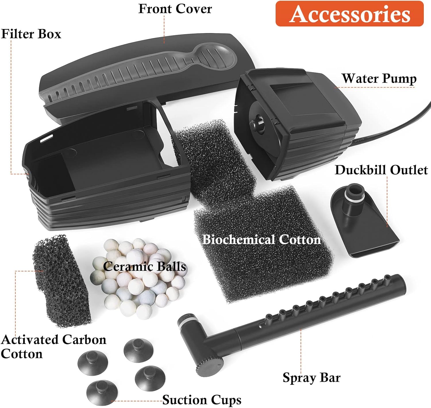 • 【Ultra Quiet Filter】For this new aquarium filter, we have improved the internal structure of the water pump to further enhance the sound insulation effect. Once the filter is placed in the water and the filter is turned on, you can hardly hear the sound of the motor, only the sound of the water spraying out. Noise Level<35dB.