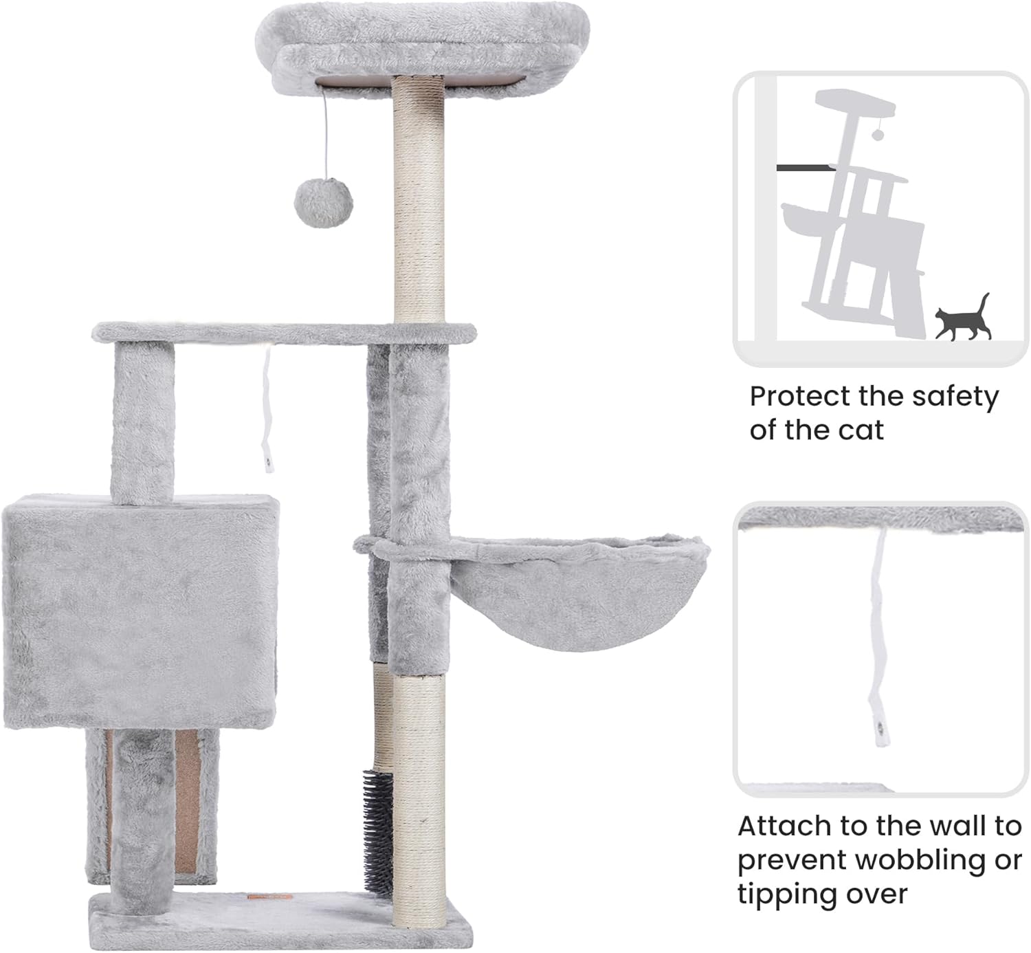 - Cat Self Groomer Brush: The cat tree has a design of self-groomer at the lower level, the soft plastic brush offers cats gentle massage and grooming and help remove and collect their hairs which is not only beneficial to cat's healthy but also create a clean environment for you and your family