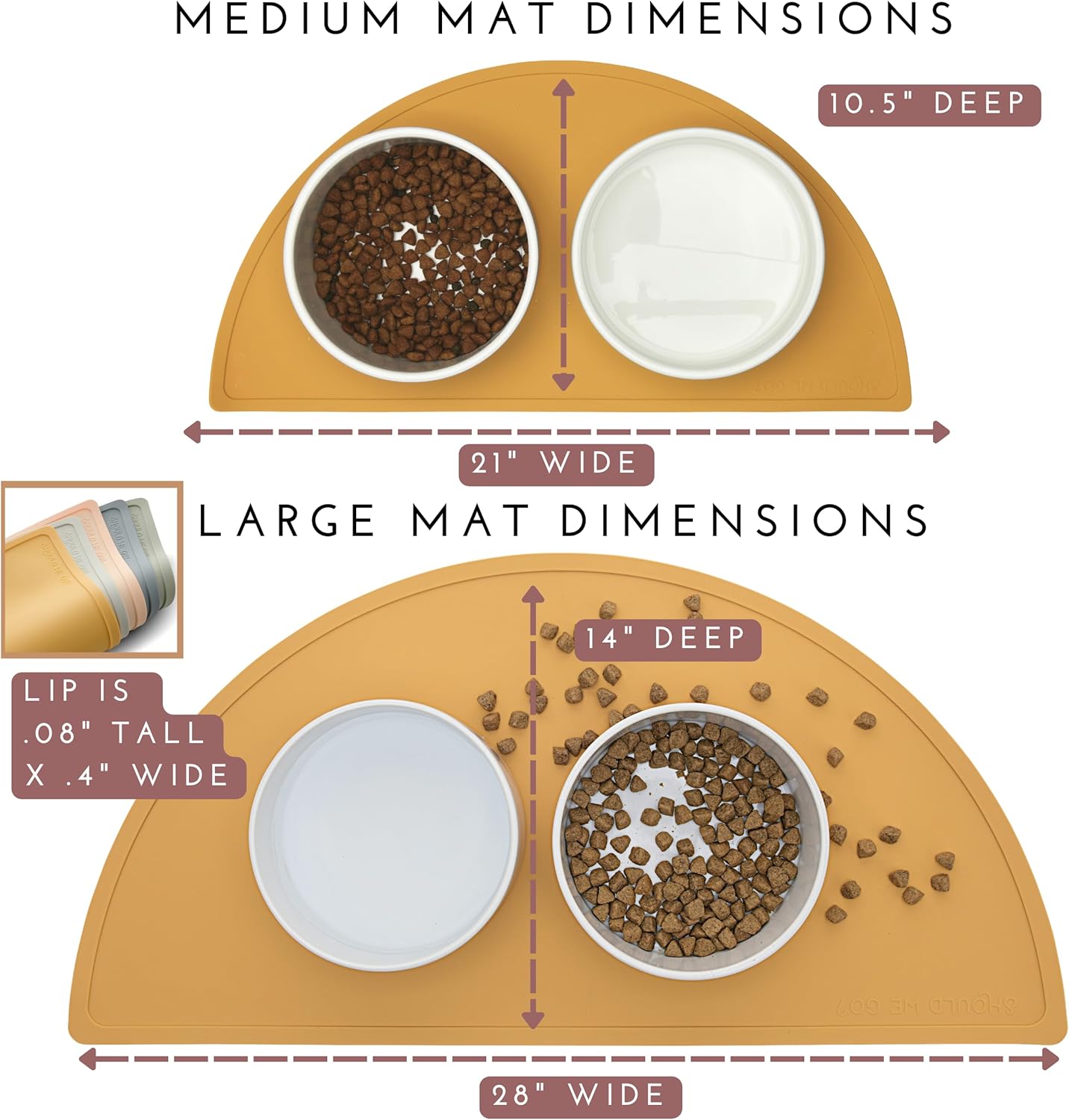 - CONTROL SPILLS AND MESSES: Our silicone pet food mat with a raised edge helps keep spills and messes on the mat. The medium size mat is 21" across x 10.5" deep. It works with bowls that are 7.5" across or smaller. The lip is .2" tall and .4" wide.