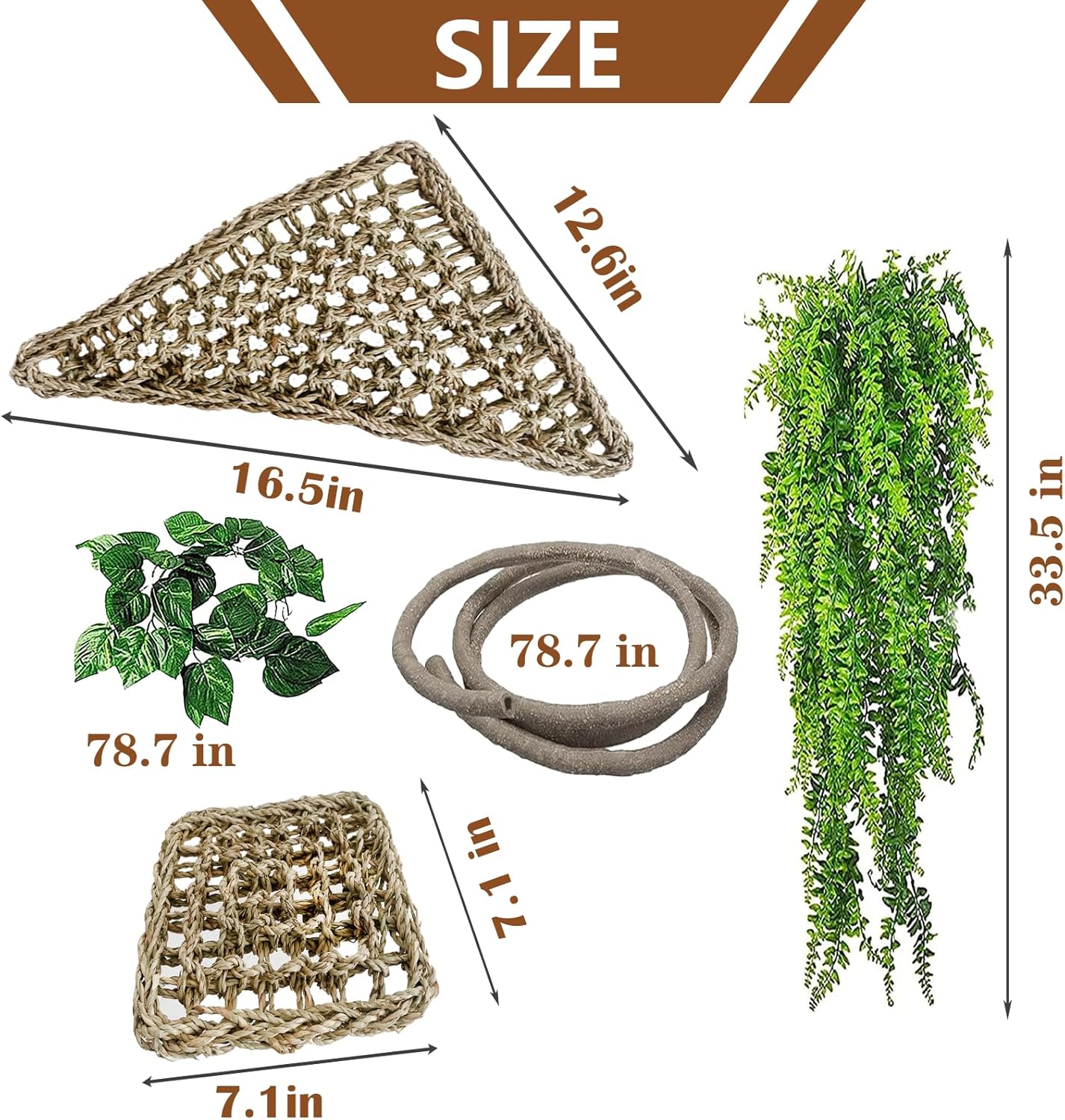 • 【Package Include】1 x Triangle seagrass reptile lizard hammock,1 x Square seagrass bearded dragon lounger,1 x reptile fake vine plants,1 x Reptile vine decoration,1 x Flexible rattan decoration,6 x clasps and 8 x suction cups.bearded dragon lizard hammock and reptile plants play a very good decorative role for your tank