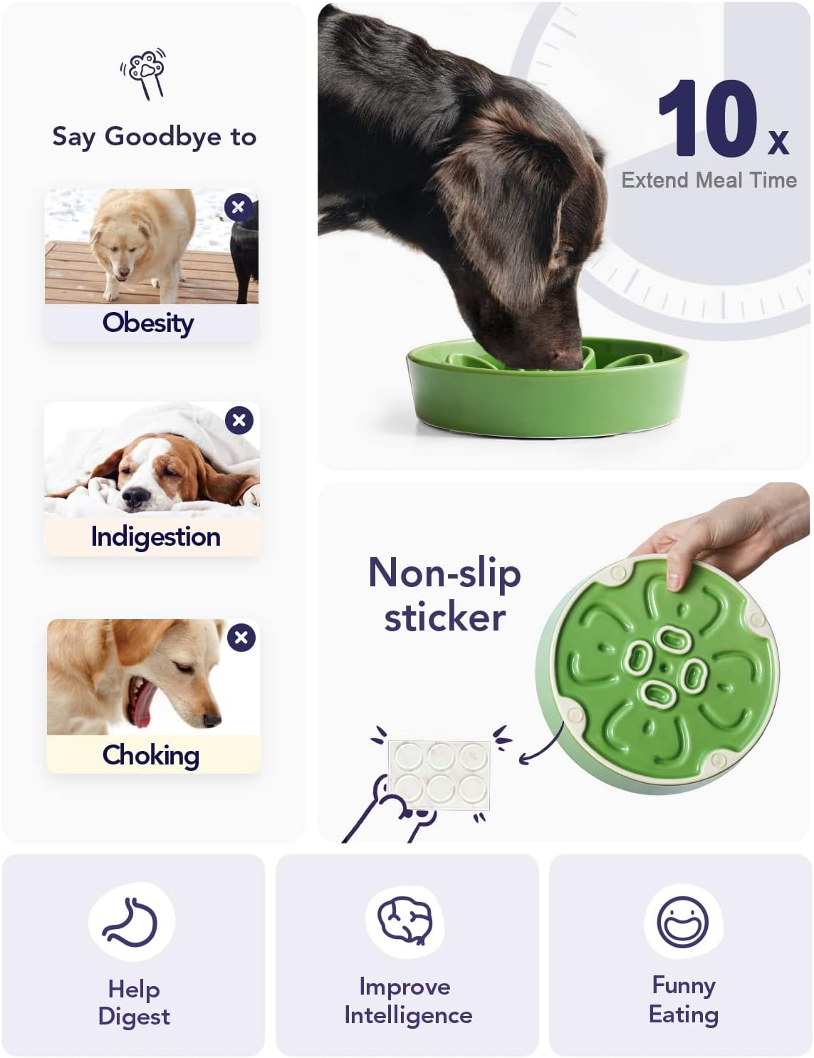 • Slow Down Eating, Bring Dog A Healthy Diet: Fast-eating dogs experience bloat, regurgitation, and obesity easily. Our slow feeder dog bowl design with the ridges and maze pattern helps your dog to eat slower than 49 times. Your dog could change his overeating behavior through a challenge and fun mealtime