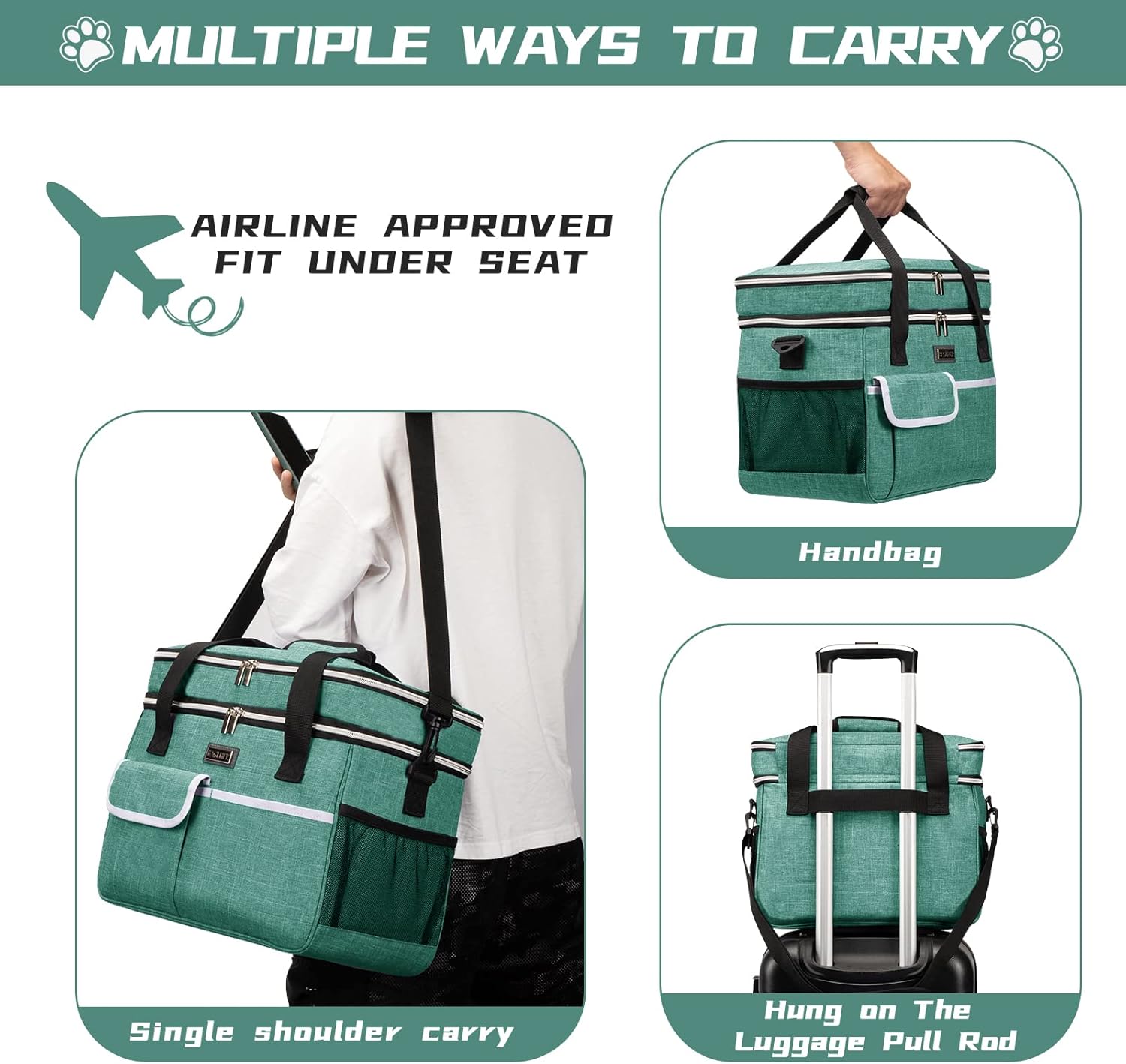 • 🐶Large Capacity and Functional:This pet travel bag has a large inner compartment to store pet treats, toys, and other pet supplies for dogs and cats!Comes with multiple functional pockets and built-in adjustable flap to stay flexible and organized.Enough storage space for all your pet's essentials.