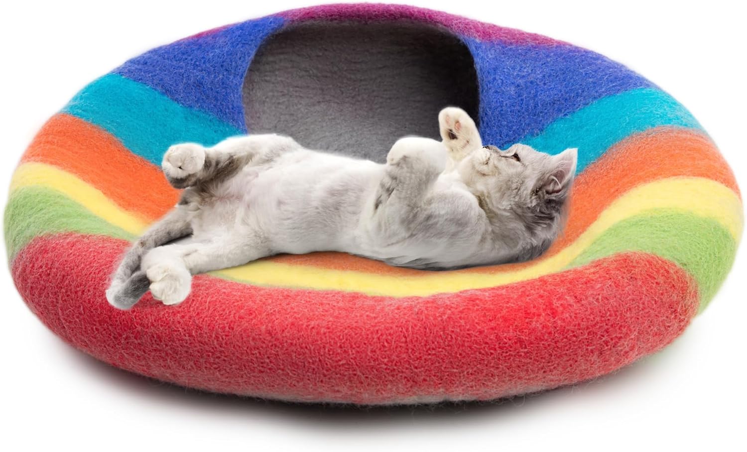 Woolygon Premium Felt Cat Cave Bed ā Wool Kitty Beds Handcrafted Kitten Caves Bed for Indoor Cats - Made from 100% Eco-Friendly Merino Wool, Foldable Cat Hidewawy Covered Cat House Pod (Rainbow Twist)