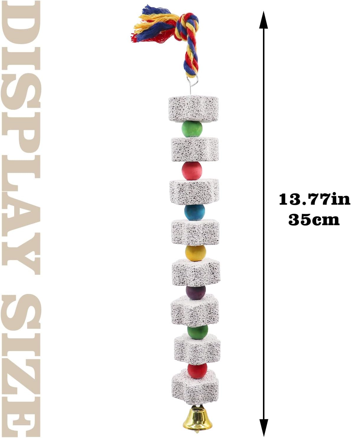 • 【Perfect Design】: The parakeet stone toy is polished into a star shape, which is both beautiful and more convenient for parrots to chew. The transition between the grinding stones is made by colorful beads, which can attract the attention of parrots on the one hand, and decorate your pet's cage on the other. There is a bell at the bottom of the bird's chew toy, which will emit a pleasant ringing sound when the bird pecks.