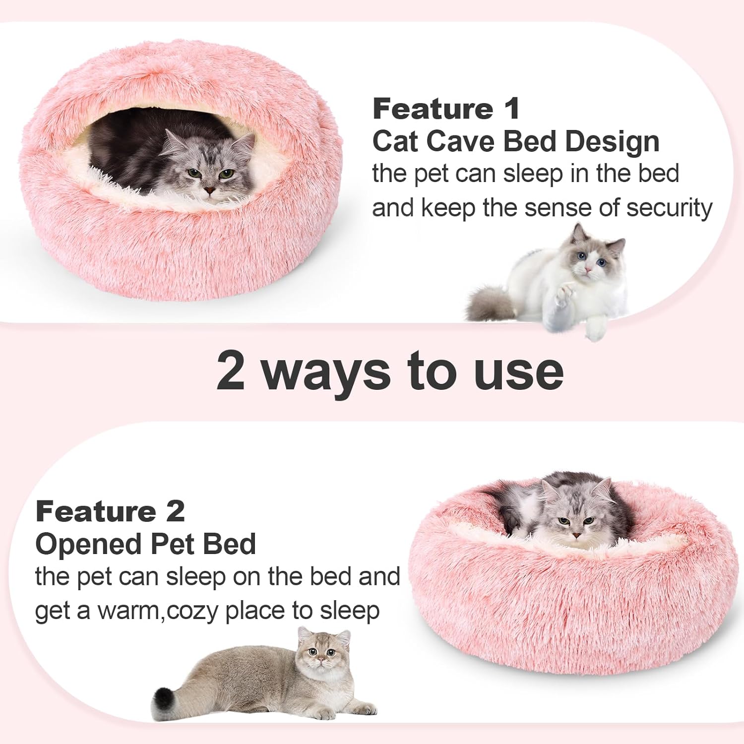 - 【Soft & Cozy Materials】This round calming covered bed is lined in fleece with a long-haired plush rim, which is a perfect place for your pet to rest and provide a secure area for cats of all sizes to hide in, helping reduce stress levels
