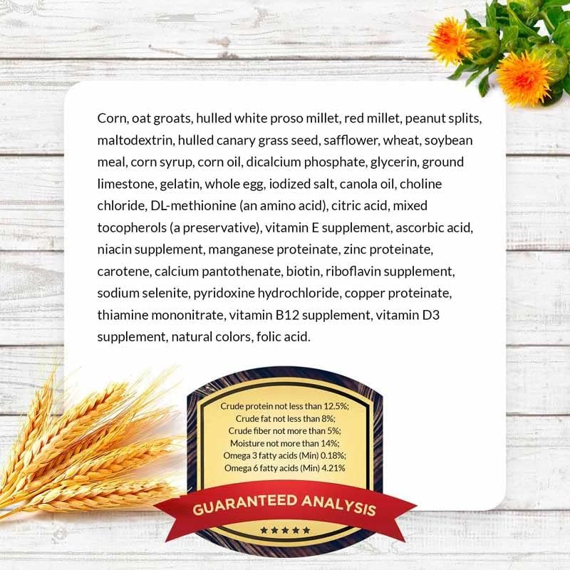 • Balanced omega 3 and 6 fatty acids to promote skin and feather health