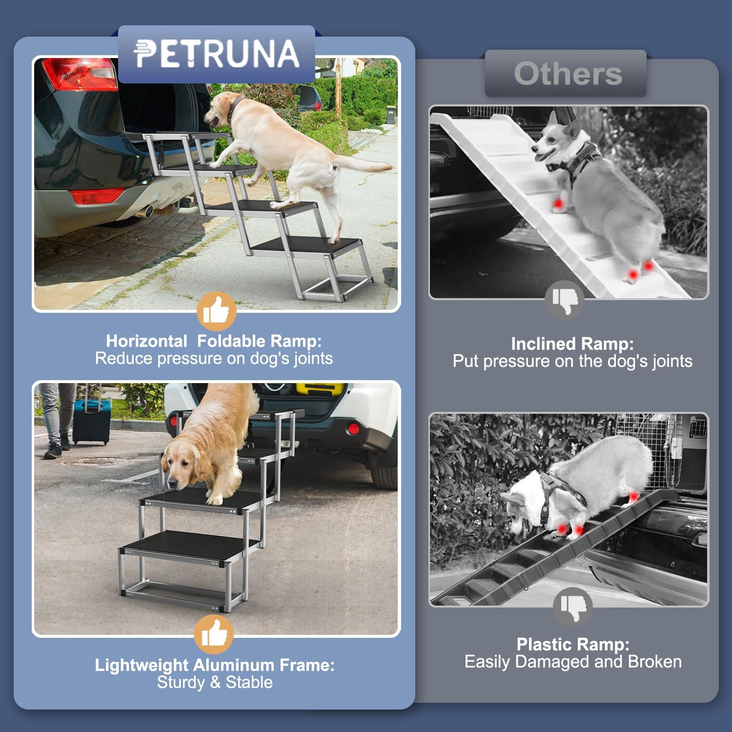 • Enhanced Durability and Upgraded Weight-Bearing Capacity: Each step of the PetRuna Dog Ramp features a rust-resistant, high-grade metal with additional load bars for a durable step that can support up to 250 pounds. It's the perfect gift to protect your pet's joints and knees from injury, keeping them safe and comfortable. The handle with foam can increase friction, provide a double layer of security for the stability of the collapsible dog steps for the car, and also help to avoid scratching the car trunk. The perfect gift for our pets, to protect their joint knee from injury.