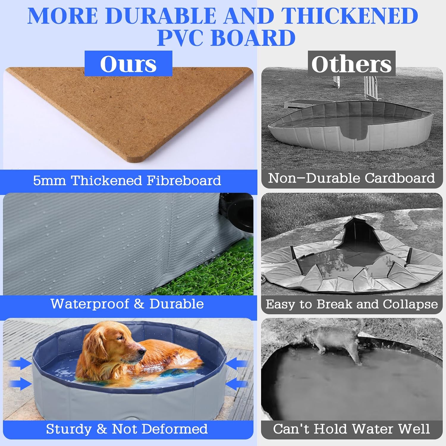 - 【High-quality Material, Sturdy Durable】The dog pool / kids pool is made of high-density fiberboard and high-quality PVC material. Strong enough and uneasy to collapse and deform. The bottom is made of abrasion resistant non-slip textured fabric, non-toxic and waterproof, perfect water retention. It also can prevent your pets from slipping when they jump around in the bath pool. Tips: Please trim your puppy's nails to prevent damage or leakage to the inner wall.