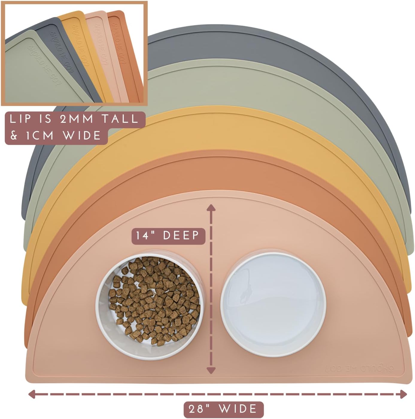 • CONTROL SPILLS AND MESSES: Our silicone pet food mat with a raised edge helps keep spills and messes on the mat. The large size mat is 28" across x 14" deep. It works with bowls that are 10" across or smaller. The lip is .2" tall and .4" wide.