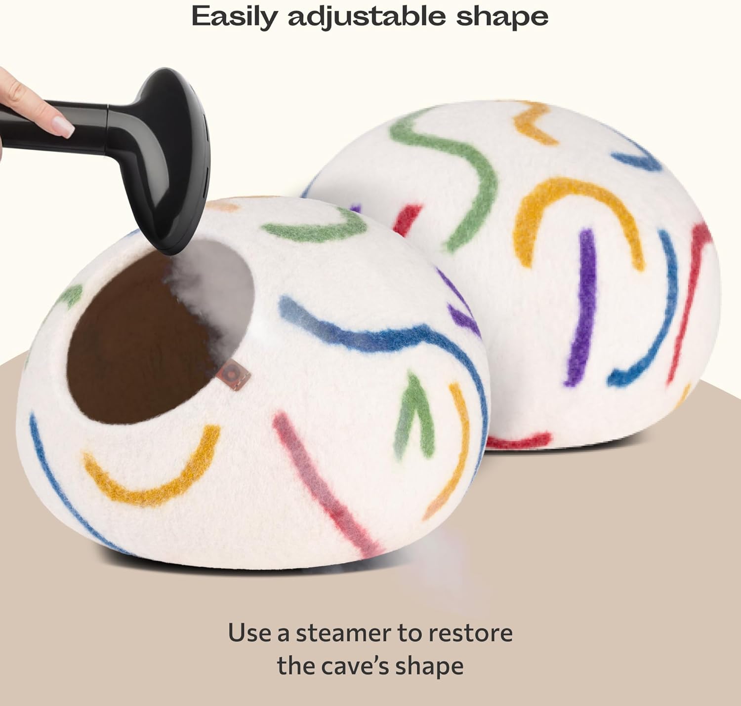 MEOWFIA Cat Cave – Premium Felt Cat Bed for Indoor Cats, Handmade 100% Merino Wool (Large, Ivory Rainbow)