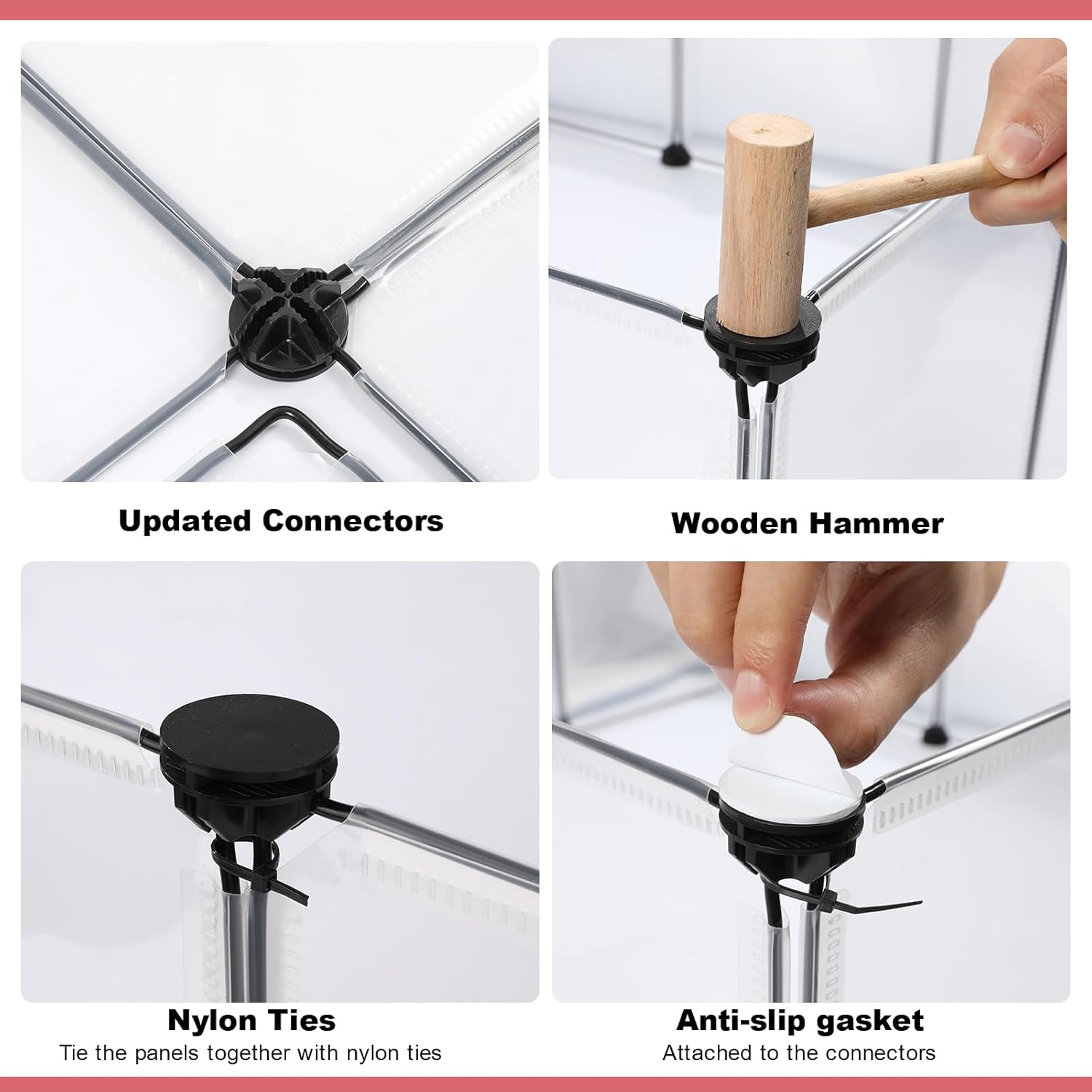 - [Pet Playpen Package]: Each set includes 12pcs 12" x 16" and 12pcs 12" x 12" transparent panels, 50pcs nylon cables, 36pcs connectors,24pcs non-slip mats,1pc wooden hammer, 1pc User manual. This small animal playpen offers a spacious and secure area for your furry friends to play and exercise. Assembled size can be 48" x 24" x 28".