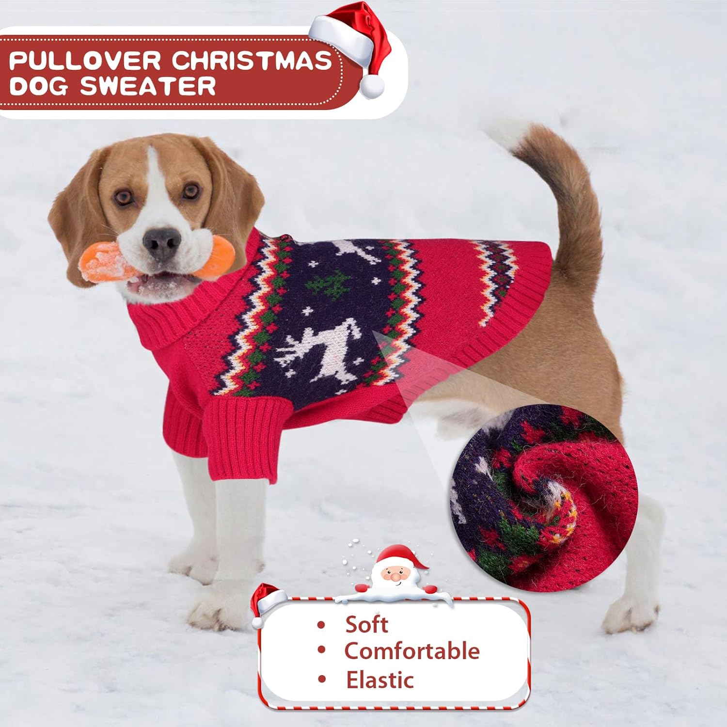 - Ambient Dog Xmas Sweater: Warm sweater for pets with reindeer, snowflake pattern and ribbed cuffs and hem. Smart leash hole on the back of the dog holiday sweater makes it easy to put on a leash when walking outdoors