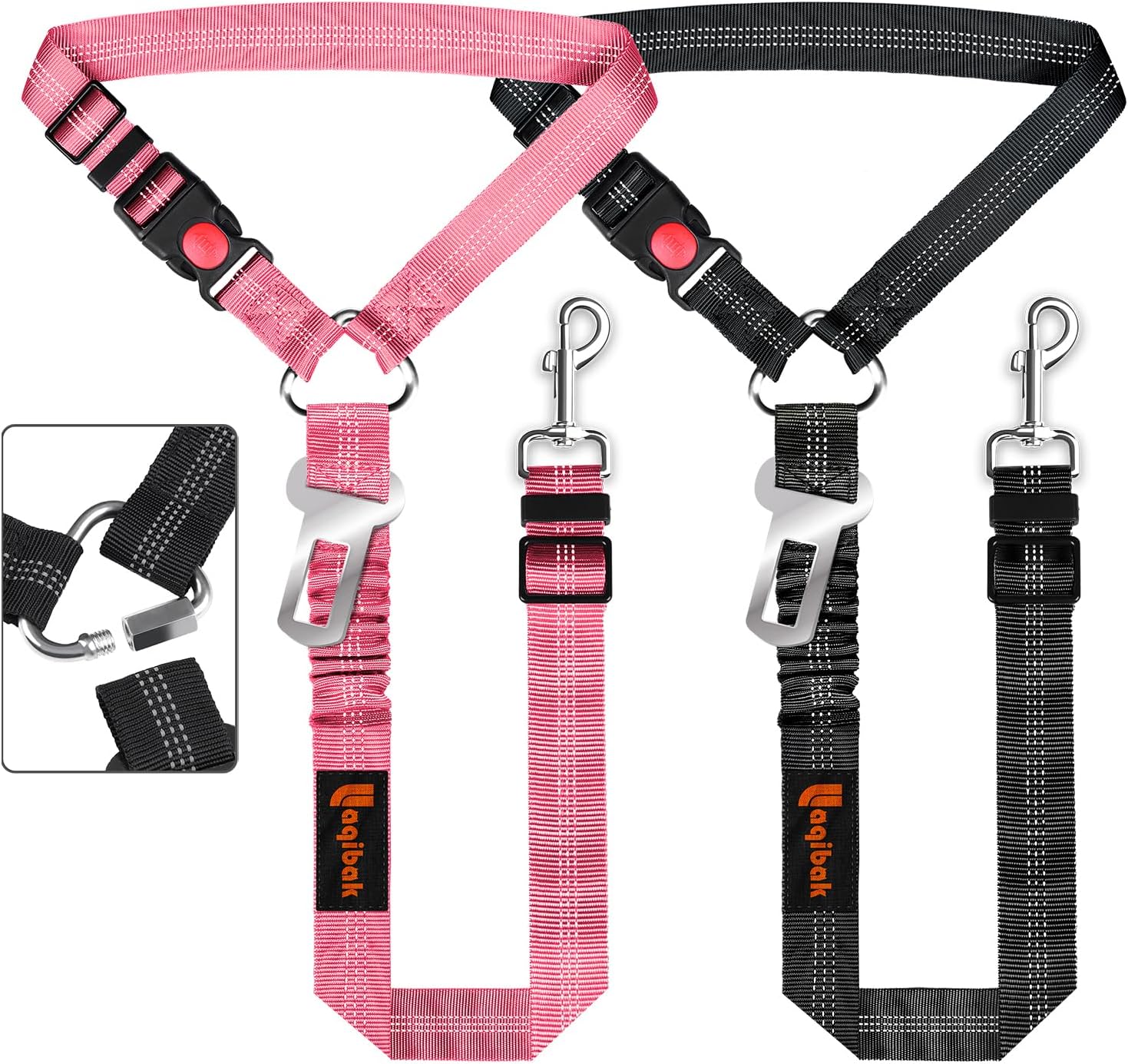 Removable Dog Seat Belt Harness for Car, 3 in 1 Pet Dog Car Seatbelt Leash, Retractable Restraint Secures to Vehicle Headrest & Adjustable Reflective Bungee Dog Seatbelt Tether, Pink and Black