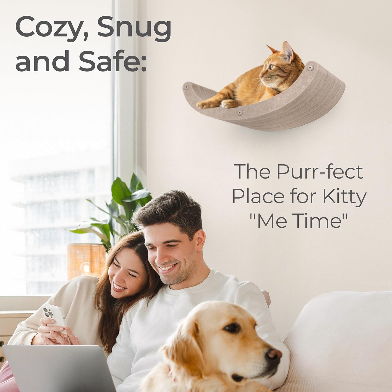 Wall Mounted Cat Hammock Bed by Pryde Pets - Floating Perch Curved Shelf, 100% Sustainable PET Felt Feline Enrichment Climber Furniture for Indoor Cats, Modern Climbing Gym Jungle Design (Oatmeal)
