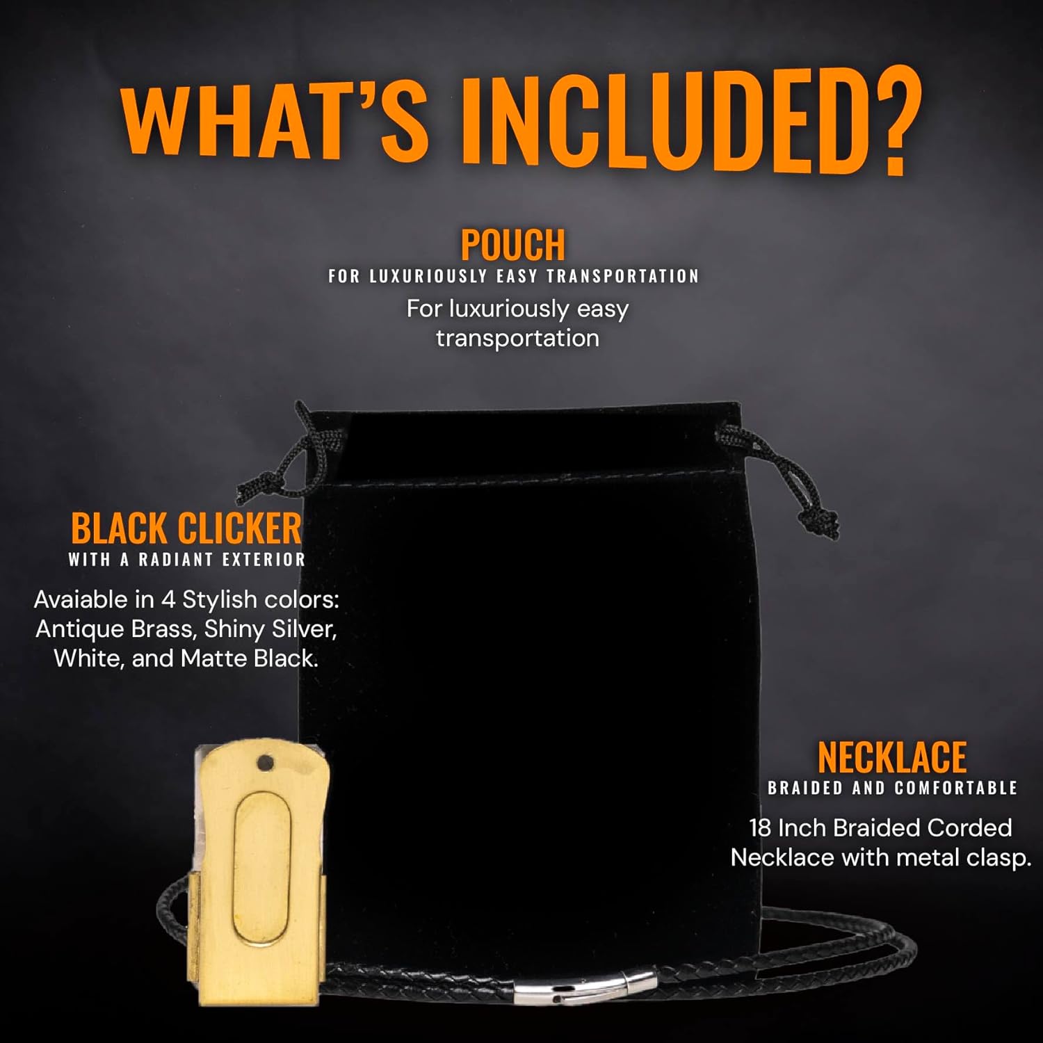 - Stand Out with Class: In a sea of ordinary clickers, our elegant Gold Puppy Training Clicker sets you apart. Embrace sophistication and style while improving your dog agility. Our dog accessories clicker product has a black exterior and also features a braided leather necklace with a magnetic metal clasp that matches your style perfectly
