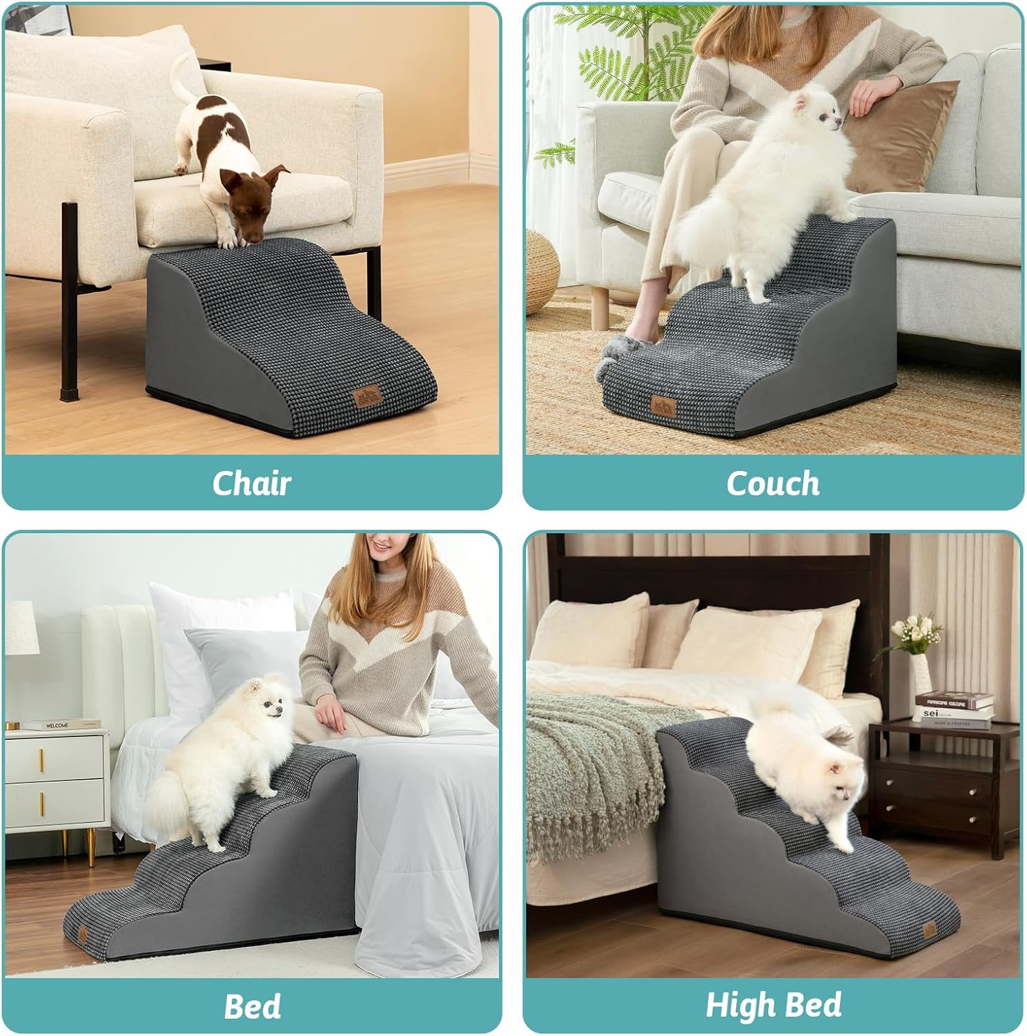 • HIGH DENSITY SPONGE: Foam dog stairs can support up to 80 pounds. Stairs for dogs to get on the bed adopt 30D high-density pure sponge, which provides better support, reducing the pressure on the joints when pets repeatedly jump on high bed, sofa, couch and car. The stairs are covered with high-quality corduroy to provide additional stability