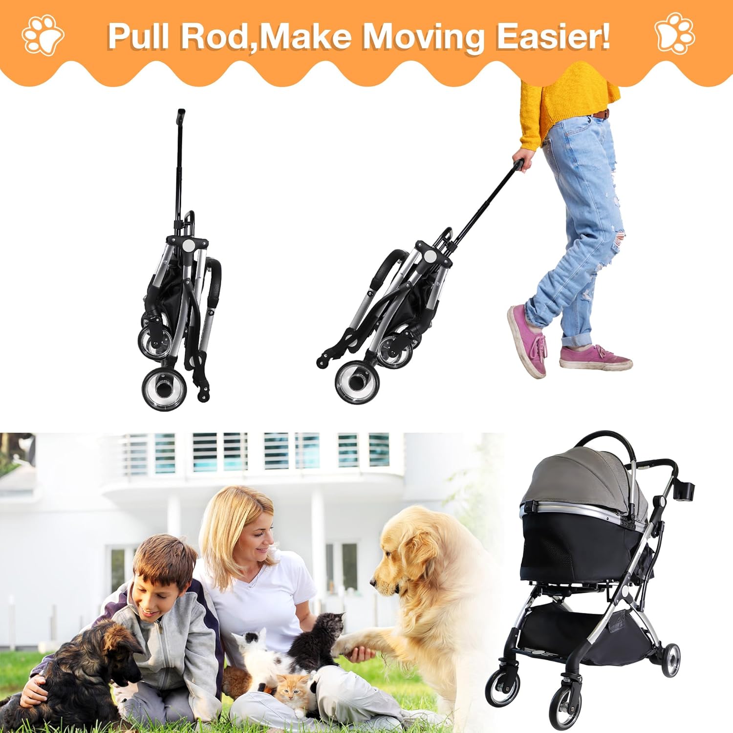 - 【Humanized Design】Our pet stroller comes with a retractable handle to for easy movement, with cup holders and large storage baskets for personal items, and a tether in the basket provides extra security for your pet. The detachable and washable pet pad also ensures maximum comfort and easy cleaning.
