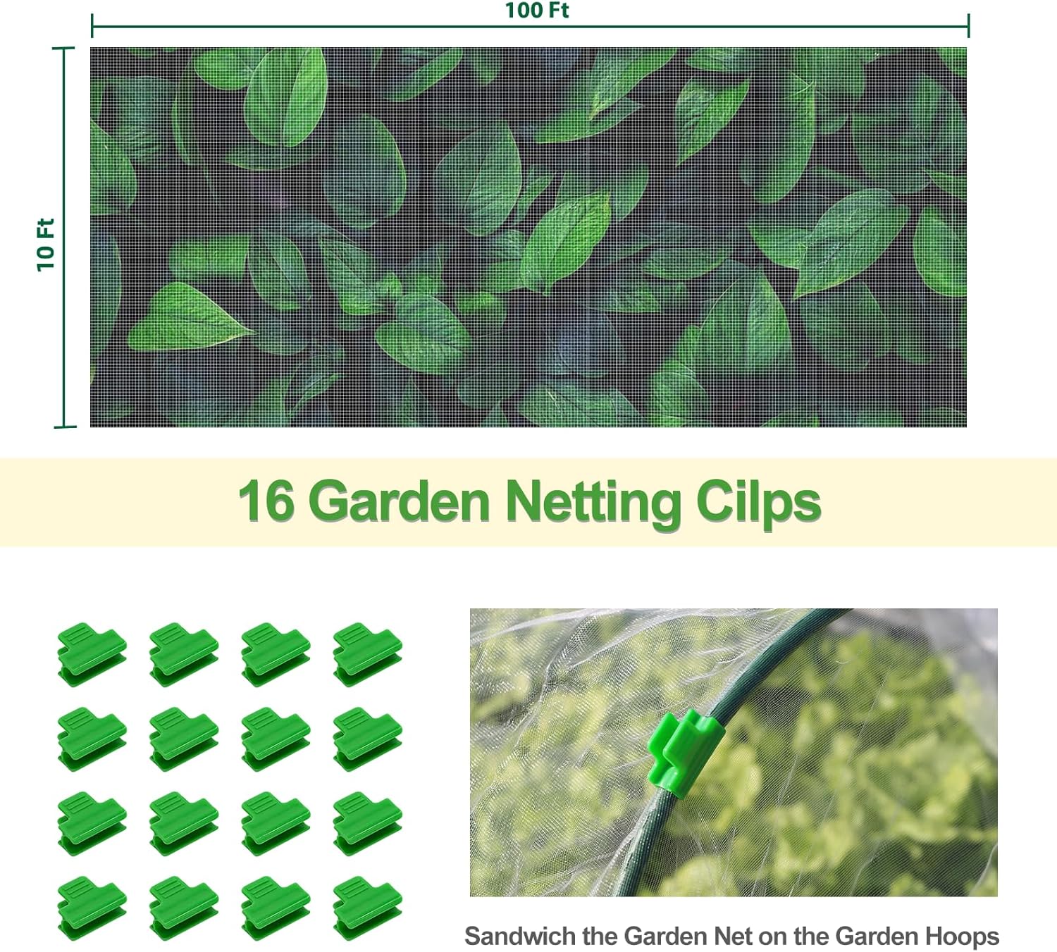 • [ Garden Plant Protector ] 10X100 feet large garden netting ultra-fine net, large enough to cover a variety of plants. And comes with 16 garden clips for you to clip the net on hoops.