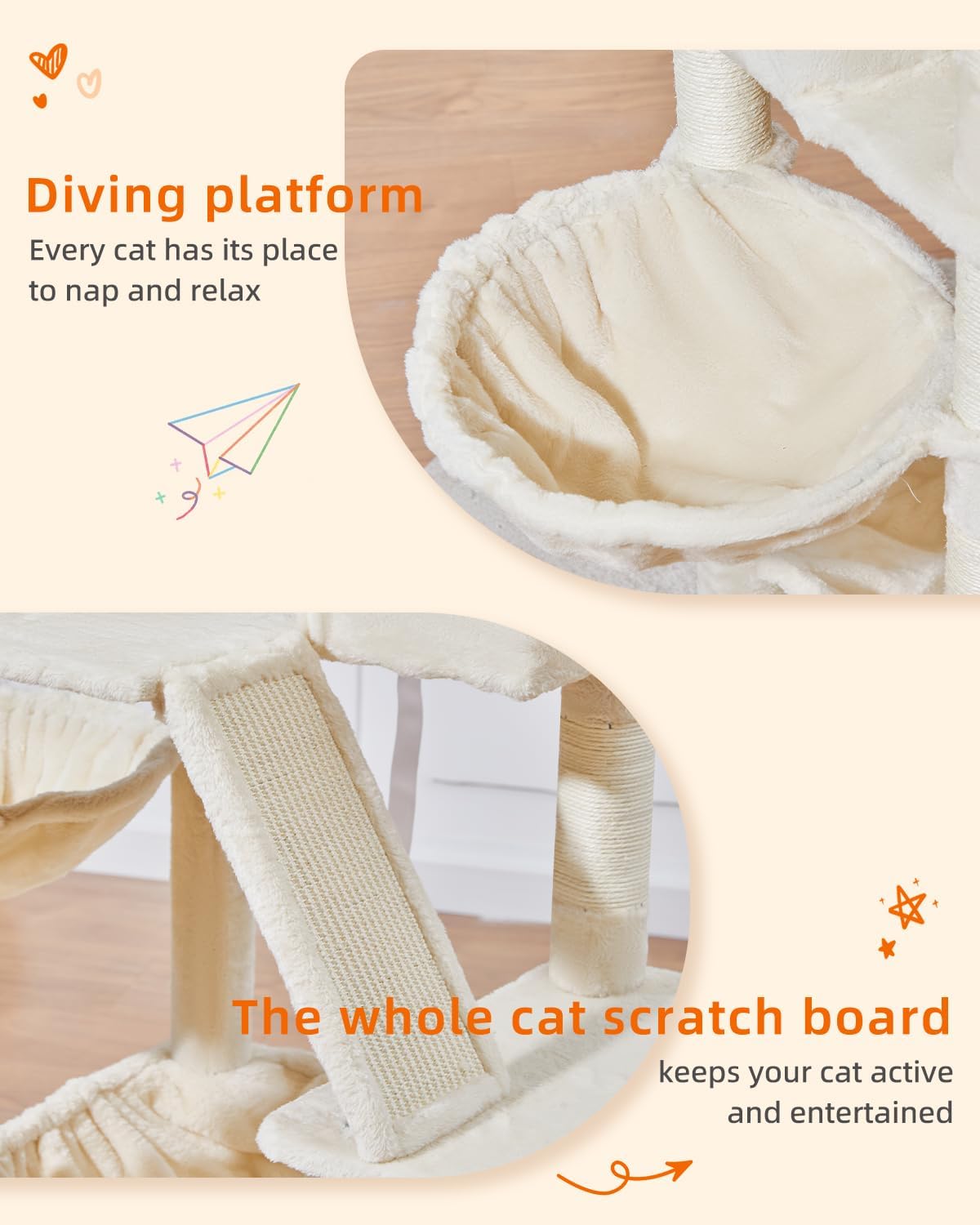 • 1.All-in-one design: There are 5 floors with 2 soft tops, 1 spacious cat apartment, 1 sisal ramp, 1 hammock and 1 hanging basket, natural sisal scratching posts and skin-friendly plush, and a multi-functional cat tree that attracts cats to play and rest.