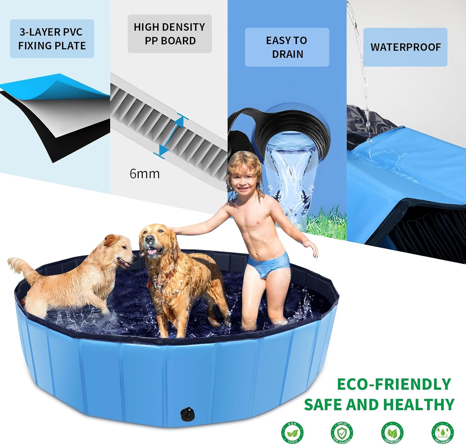 - 🐕【Sturdy Durable dog pool】:The kids pool is made of 0.5mm thickened PVC material and built-in 6mm high-strength PP hard plastic board which is thicker than ordinary fiberboard, ensuring that the hard plastic pool is not prone to toppling over. The anti-skid bottom can prevent your pets from slipping when they jump around in the foldable pool.