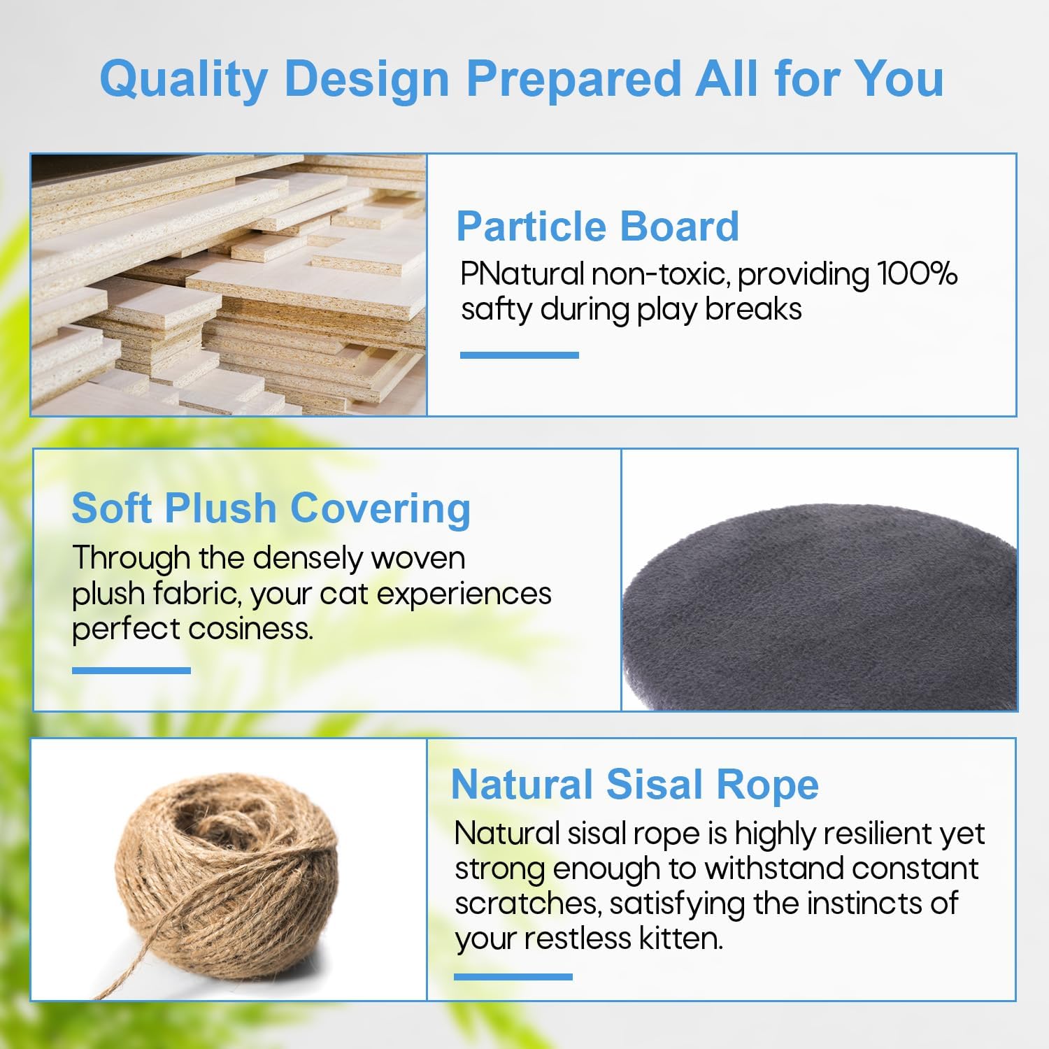 • 🐱 【Posts for Scratching Covered in Sisal 】These are scratching surfaces that are integrated into the framework. Cats love to bury their claws in sisal because it's a sturdy substance with a coarse texture. Our cat tree promotes healthy scratching habits and helps discourage cats from damaging furniture by offering dedicated spaces for them to scratch.