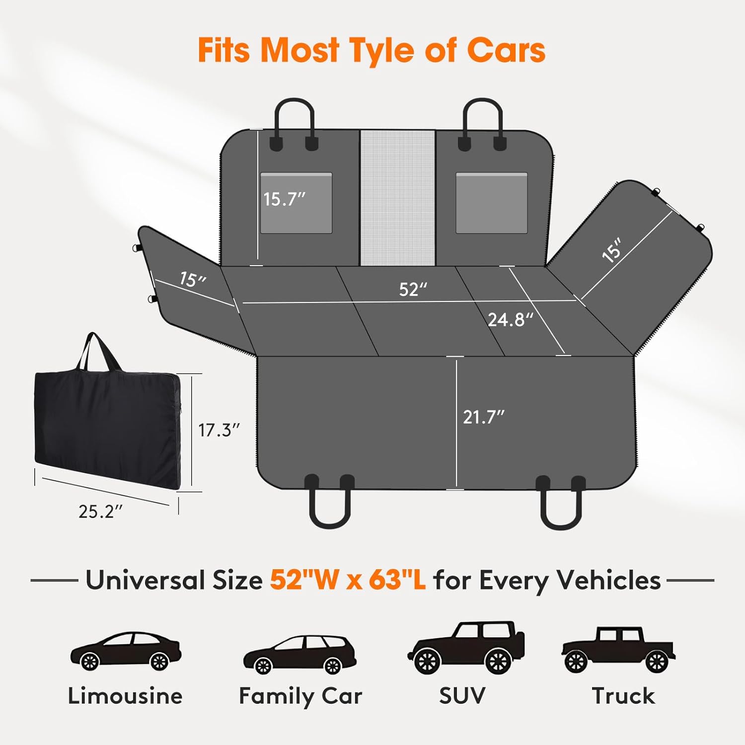 - ă6-Layer Durability & ProtectionăNo more slouchy dog seat covers! Unlike the traditional seat cover being soft and easy to collapse, it can hold up a weight capacity of 280 lbs, making it suitable for various dog sizes! The 52"W x 63"L backseat seat covers for cars uses the new upgraded fabric of 6-layer fabrics, this dog back seat cover is waterproof to protect your seat from mud, liquid, and hair.