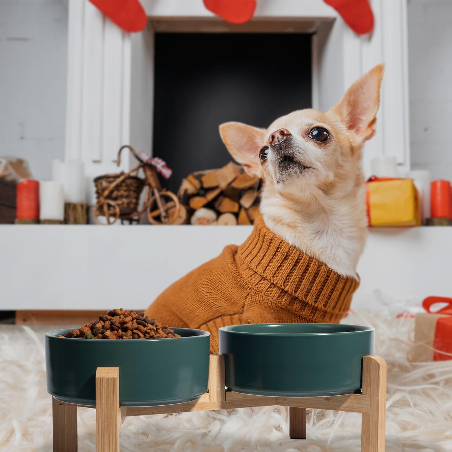 Elevated Ceramic Dog Bowl Set - Raised Feeding Bowls with Non-Slip Bamboo Stand - Small Pet Dishes for Food and Water - Ideal for Cats and Puppies - 16.23 OZ - 2 Cups - 480 ML