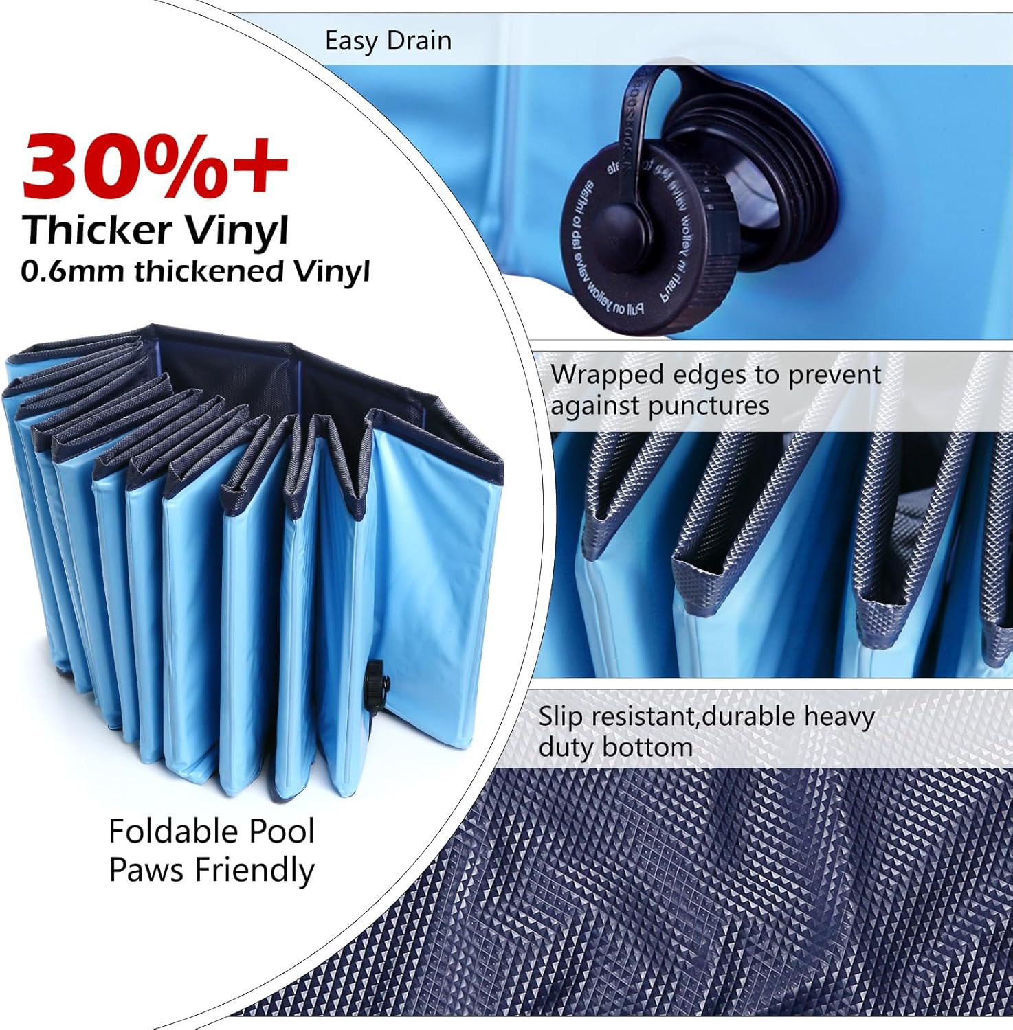 - Slip Resistant and Paws Friendly --- Inner wall and the bottom is made of extra-tough embossed plastic. Thick and non slip bottom. No slips and falls. Full size pools for puppy, small dogs, medium dogs and large dogs and kids. Please Trim your dogs' nails before using the pool.
