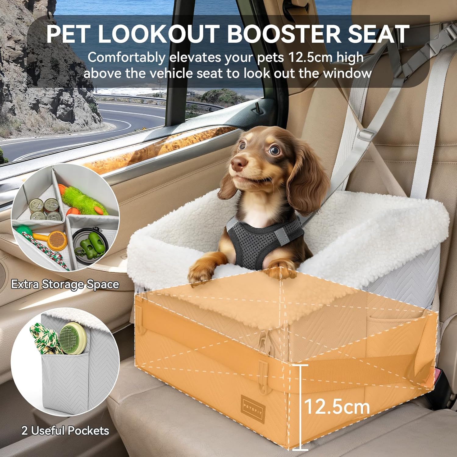 • [Dual-Sided Comfort Cushion] The dog booster car seat medium sized dog featuring a unique cushion design with one side soft fleece and the other durable Oxford cloth, it meets different weather and pet needs. The cushion is detachable and washable. With comfortable fleece-lined edges, the car seat for dogs offers your pet a first-class comfort experience during rides