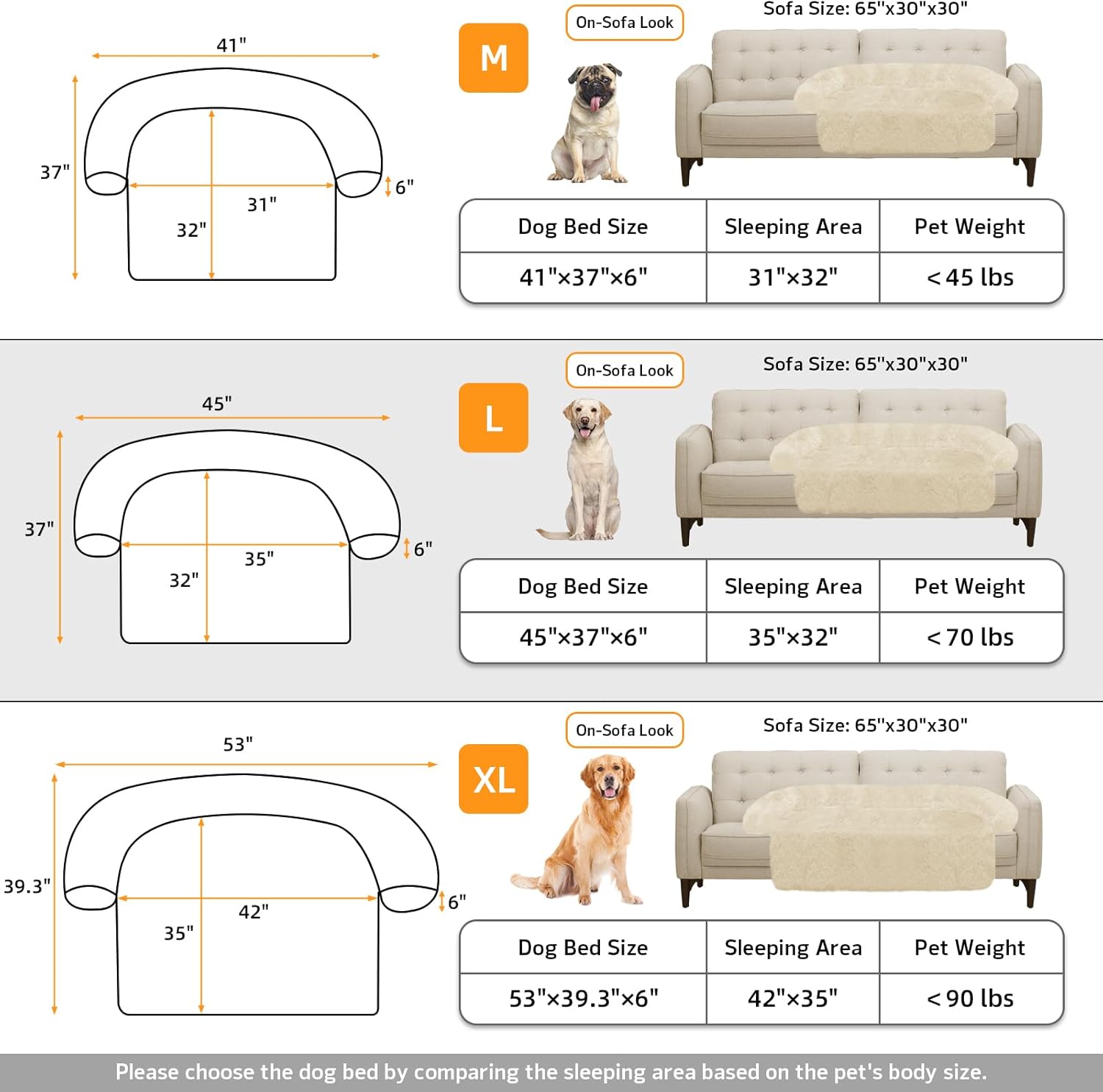 - 【Multiple Size Selection】The couch pet bed has 5 sizes for you to choose from. XS: 31"x23.5" dog bed for small pets. S: 35“x31" dog bed for cats and small dogs. M: 41”x37" dog bed for medium dogs. L: 45“x37" dog bed for large dogs. XL:53"x39" dog bed for large dogs. We have enlarged the sleeping area for pets to give dogs more space.